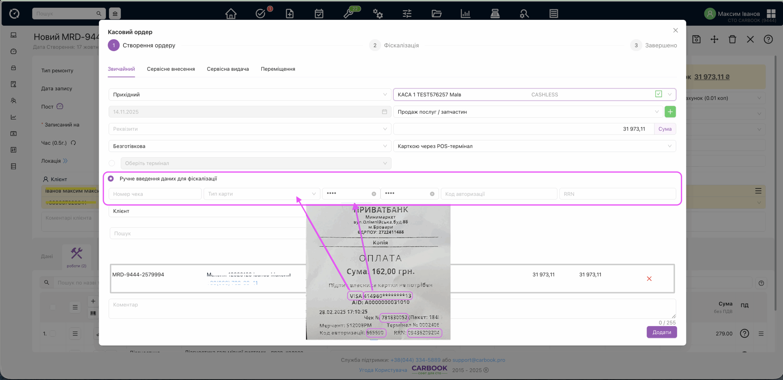 Якщо необхідно провести безготівкову оплату через “Карткою через POS-термінал”, то заповніть необхідні поля, інформацією отриманою від чека з терміналу, яку буде передано в податкову через ПРРО.
