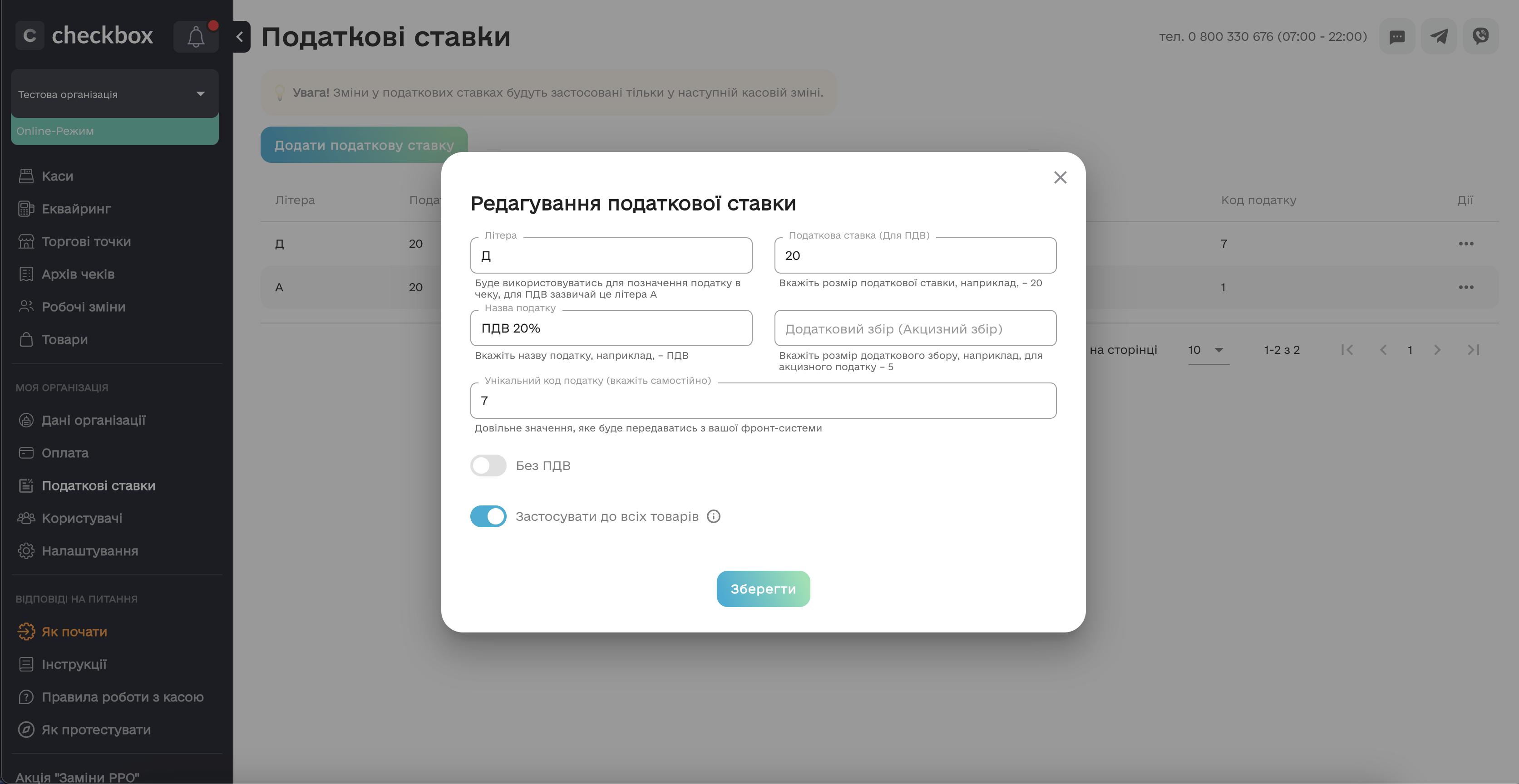 - Додайте податкові ставки в Checkbox.ua або Cashdesk.ua. Приклад, з checkbox.ua.