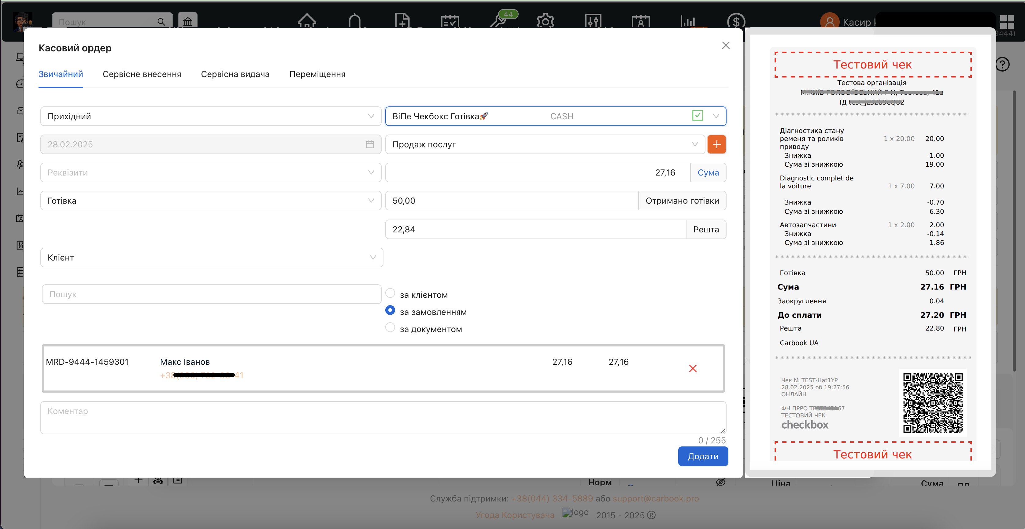 - Створіть тестове замовлення, додайте товари/послуги, оберіть тип оплати (готівка чи безготівка).