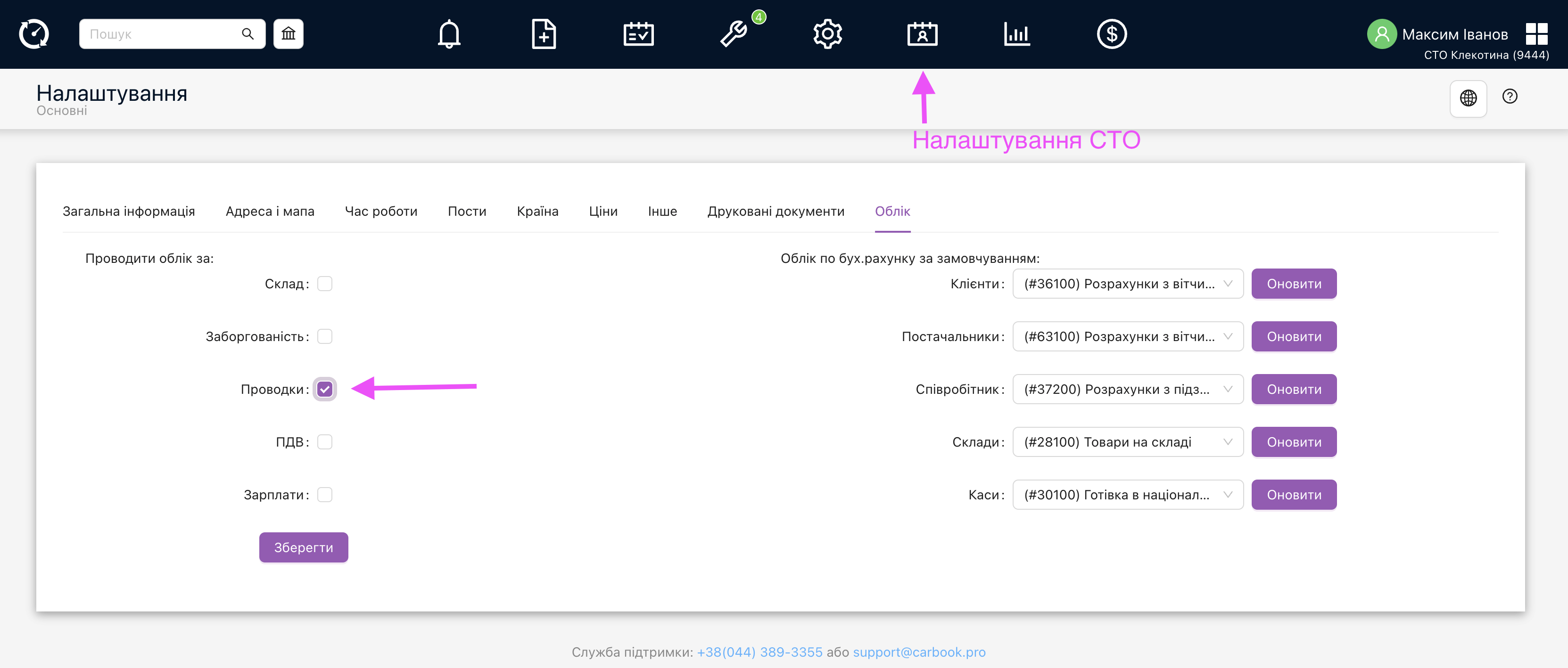 Для початку роботи з проводками, необхідно увімкнути в налаштуваннях СТО “Довідники та налаштування” – “Налаштування СТО” – вкладка Облік (відкривається під правами super admin) — чекбокс “Проводки” і за необхідністю змінити поля, “рахунки за замовчуванням”. Ці налаштування показують, чи створювати записи у відповідних таблицях під час врахування документів.
