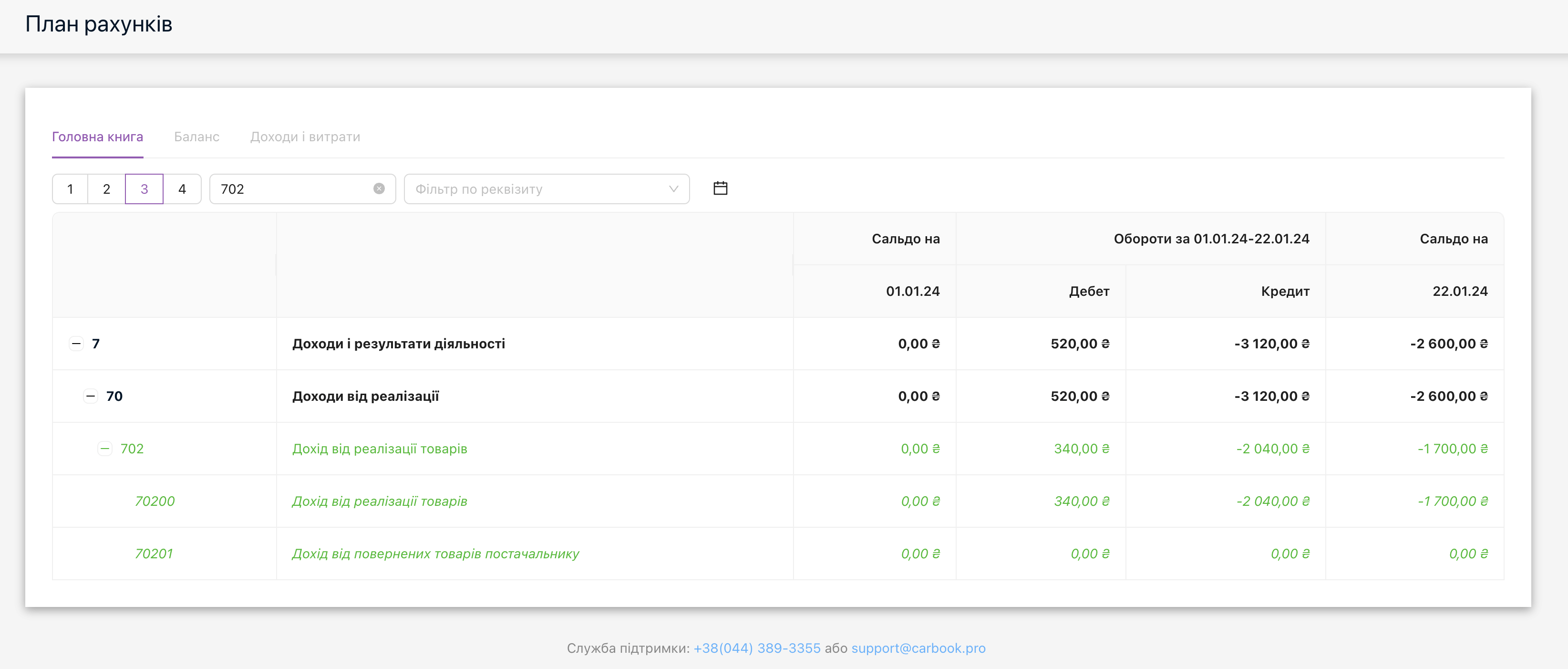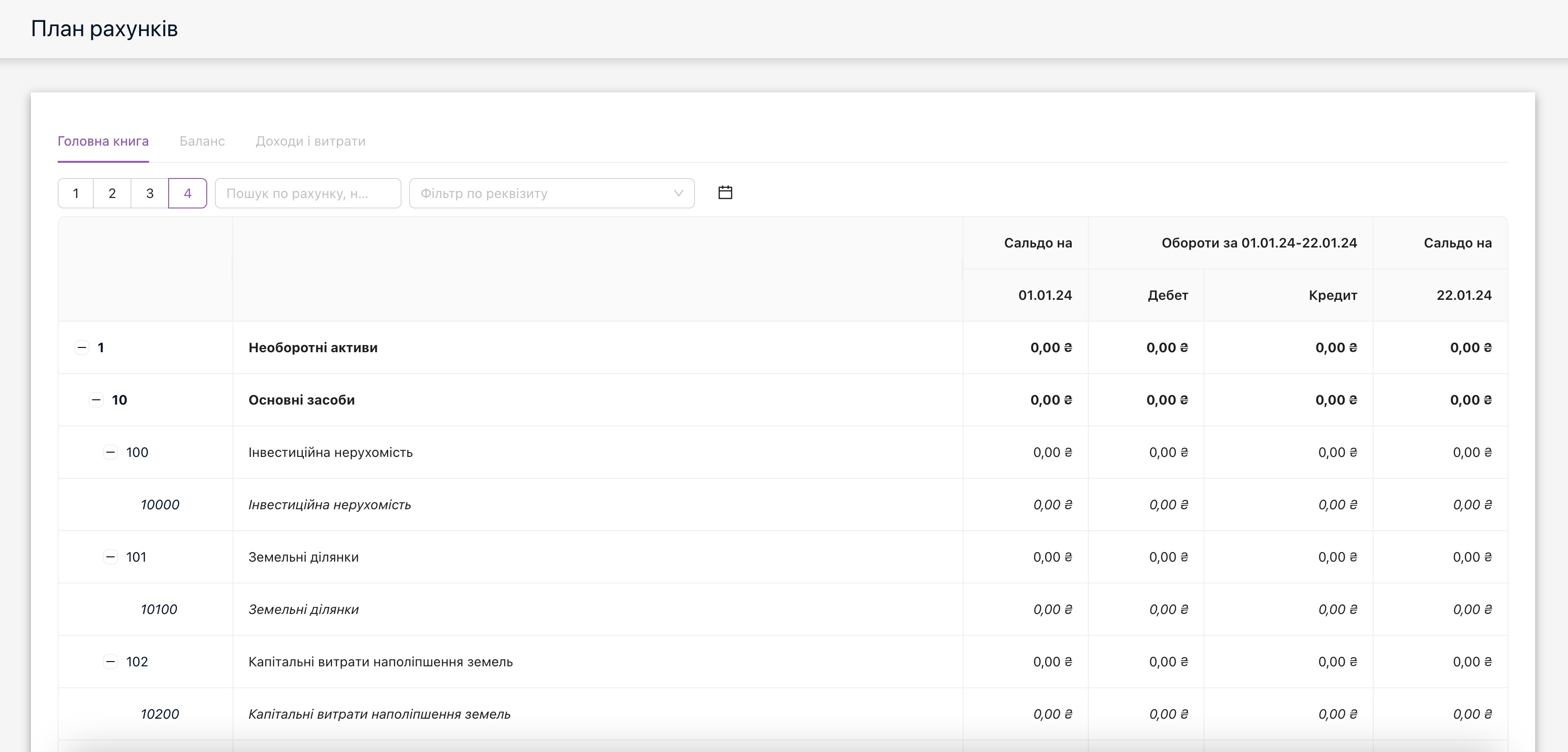 Рахунки є 4 рівнів, кнопки 1,2,3,4 під написом «Головна книга», натиснувши на конкретний номер рахунку ви можете подивитися його застосування, опис його субрахунків та типову кореспонденцію проводок. Є поля пошуку по рахунку, назві чи реквізитам та фільтр по даті.