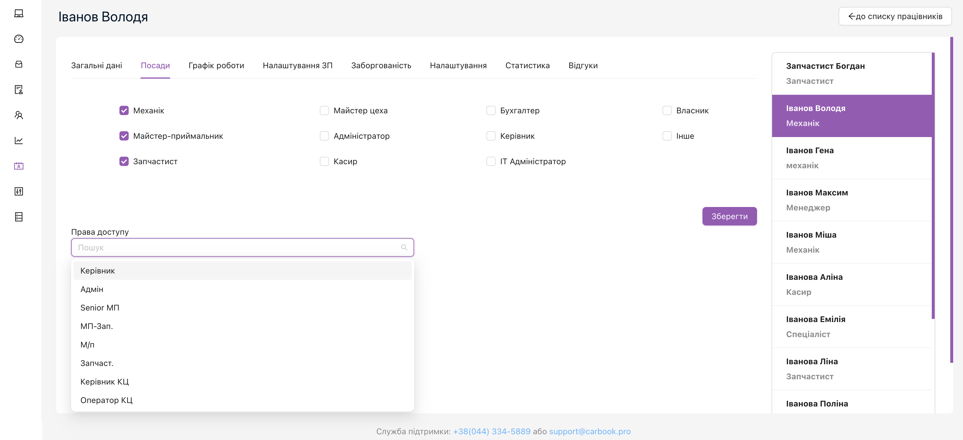 Далі потрібно налаштувати доступ працівнику до програми. Для цього в картці працівника переходимо в таб “Посади” і в полі “права доступу” вказати роль, яку буде мати працівник. Наприклад, роль “керівник” — це максимально можливий доступ в межах пакета по програмі. Більше про можливі варіанти та їх обмеження, прочитайте, будь ласка, в статті “Права та доступи в CARBOOK“. В цій статті також описано варіант, коли стандартної ролі не достатньо і треба створити власну роль.