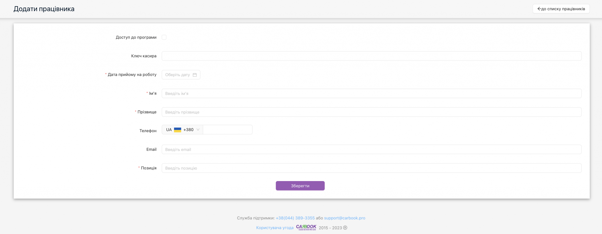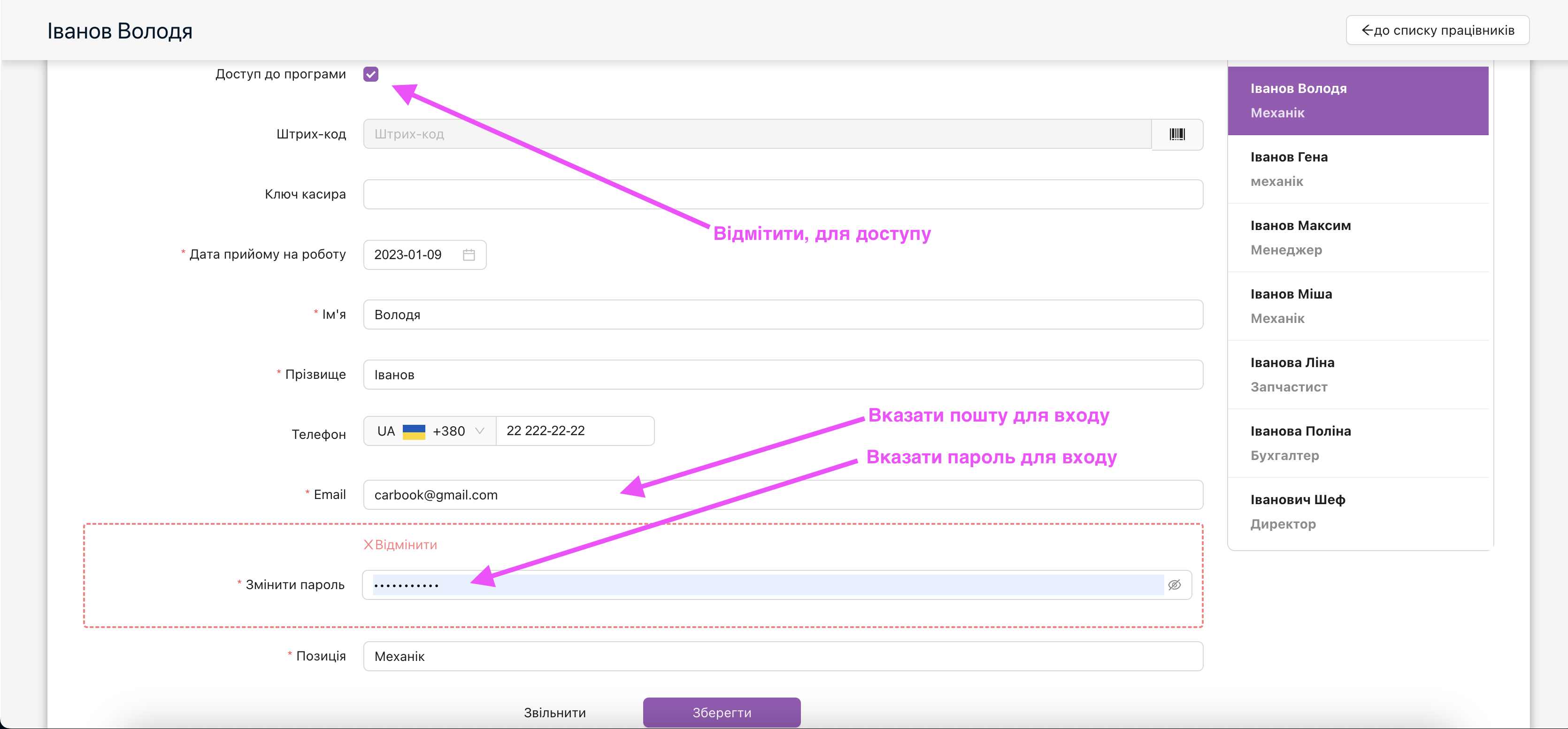 Якщо робітнику потрібен окремий акаунт, то треба поставити галочку “Доступ до програми” та встановити пароль, таким чином, робітник буде заходити до системи через свої дані.