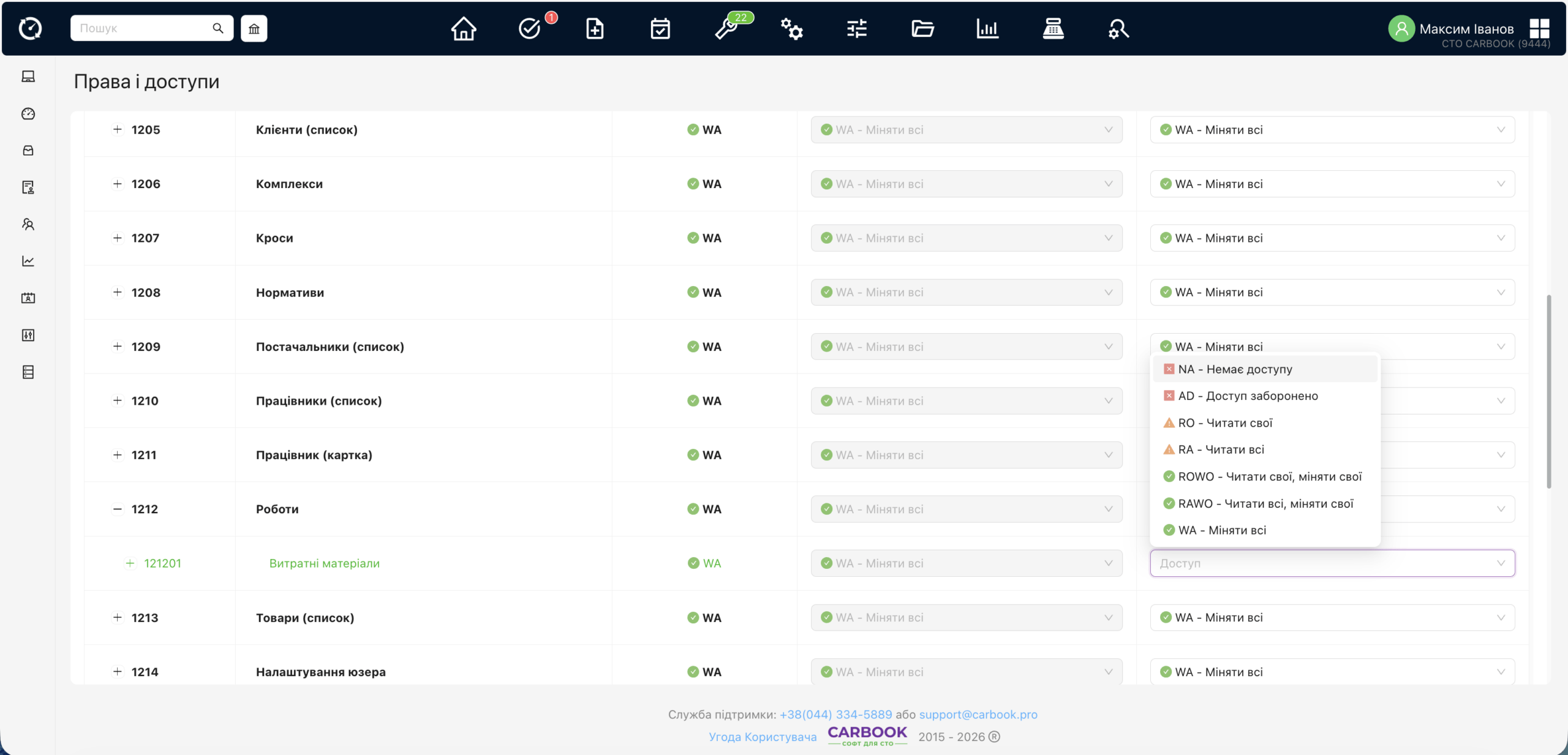 Безпека на висоті: додані права доступу (121201 — Витратні матеріали). Ви можете обмежити, хто бачить, переглядає чи редагує матеріали в довіднику робіт — ідеально для великих команд, де певні працівники не повинні налаштовувати систему.Витратні матеріали – налаштування прав доступу.