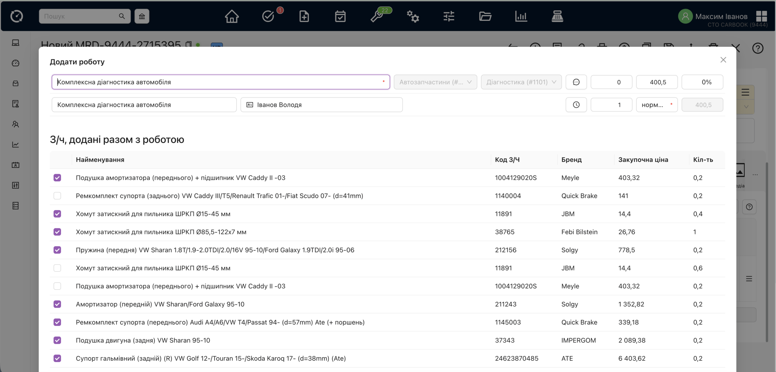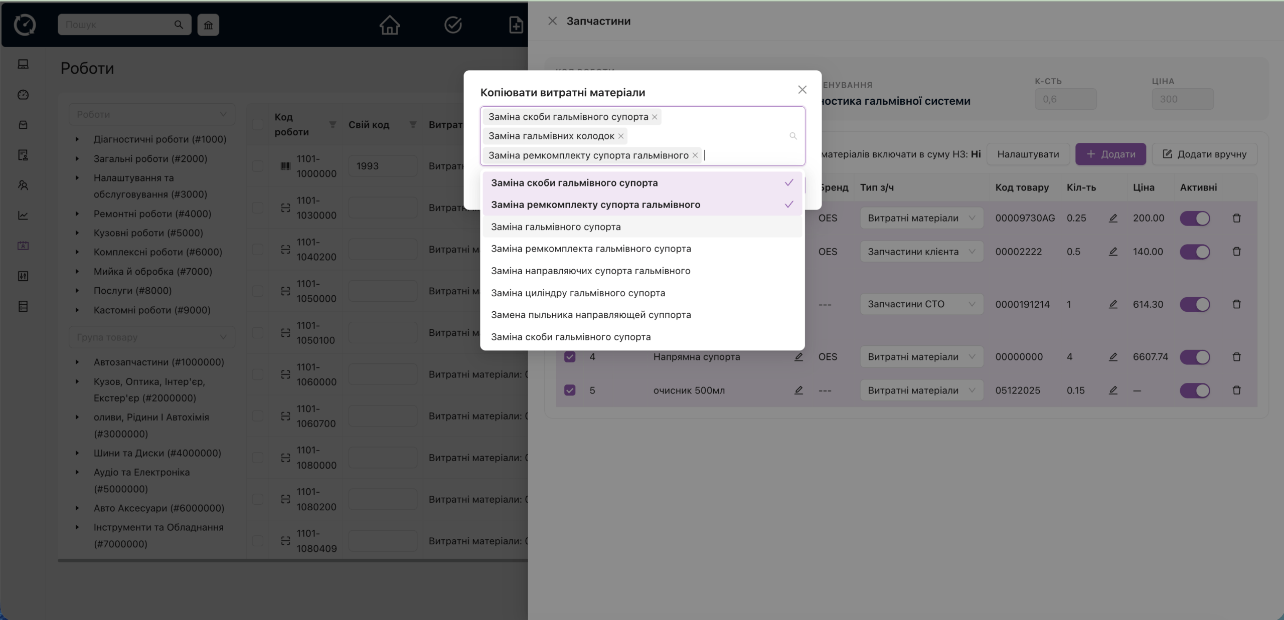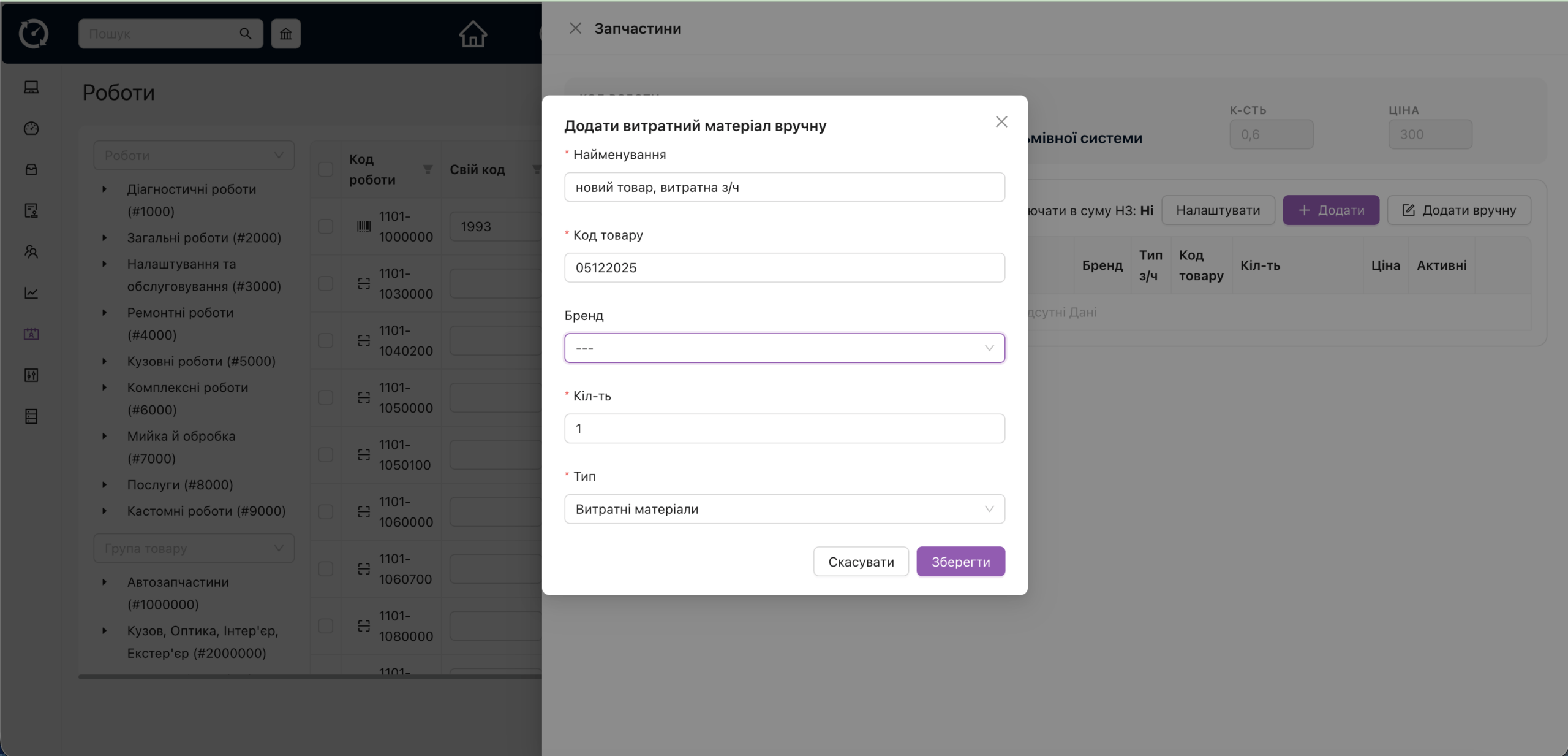 Переходимо до додавання в н/з — серце автосервісу. Якщо матеріали прикріплені до роботи в довіднику, вони автоматично потрапляють у н/з при додаванні послуги. Система враховує налаштування (увімкнені/вимкнені), тож нічого зайвого не з’явиться. У модальному вікні “додавання роботи” ви бачите попередній перелік матеріалів і можете його скоригувати — наприклад, зменшити кількість оливи для компактного авто.Н/з – модальне вікно додавання витратних матеріалів разом з роботою.