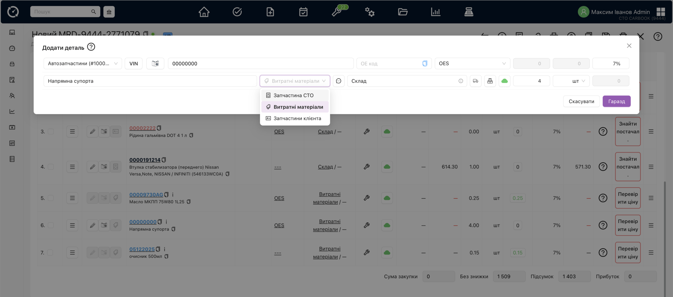 У вкладці “Запчастини” н/з є окреме модальне вікно для редагування: змініть тип запчастини в селекті, і система автоматично адаптує поля закупівельної ціни, продажної ціни та кількості. Це спрощує перехід від “витратних матеріалів” до “запчастини клієнта”, якщо ситуація змінилася. В самому н/з – відображається тип запчастини іконкою та кольором: “Запчастини клієнта” – червоний колір, “Витратні матеріали” – синій колір і “запчастина СТО” – чорний колір.