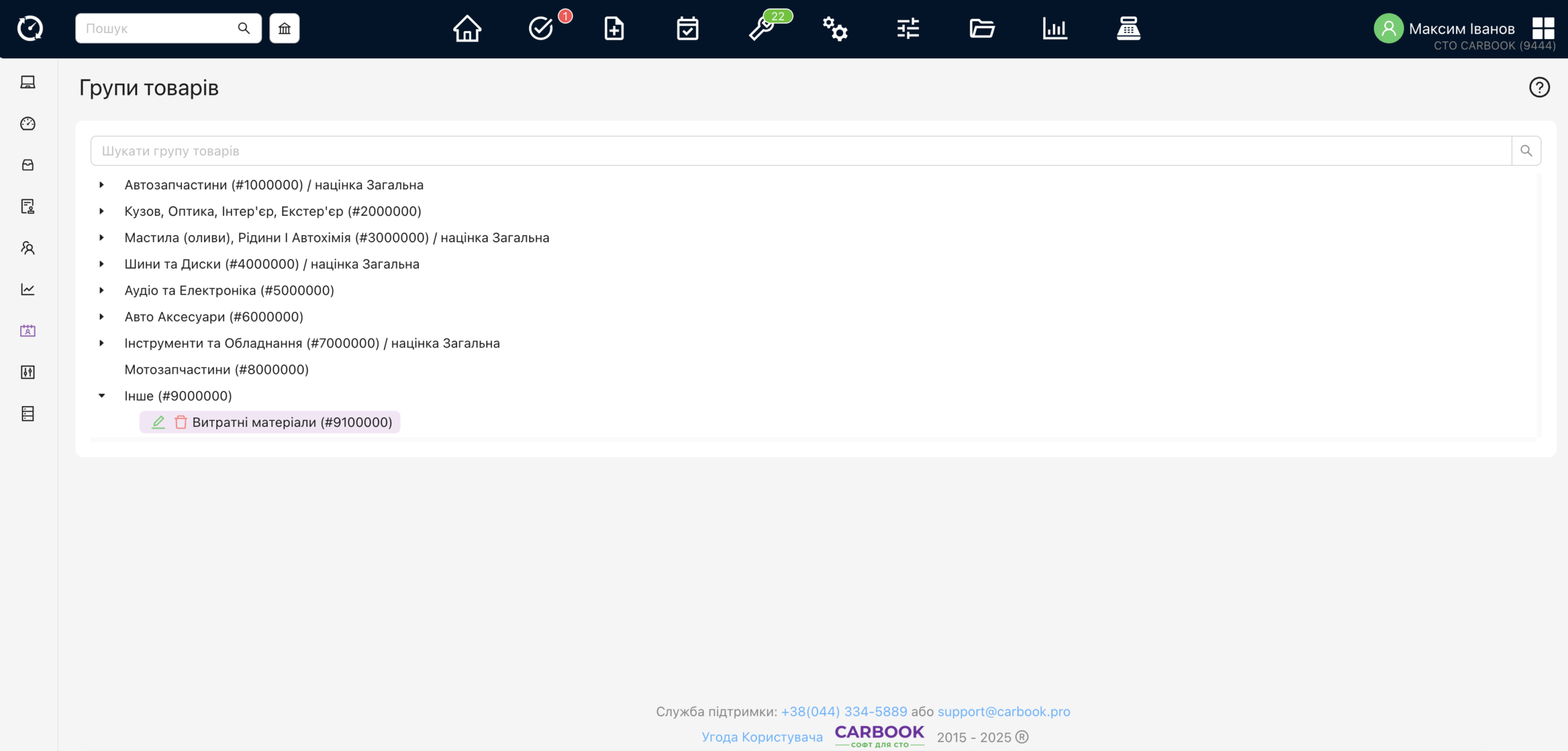 Для груп товарів створено спеціальну категорію “Витратні матеріали (#9100000)”, де всі картки цих товарів згруповані. Це полегшує пошук і аналітику — наприклад, швидко перевірити залишки мастил.Довідник груп товарів – додана окрема група для витратних матеріалів.