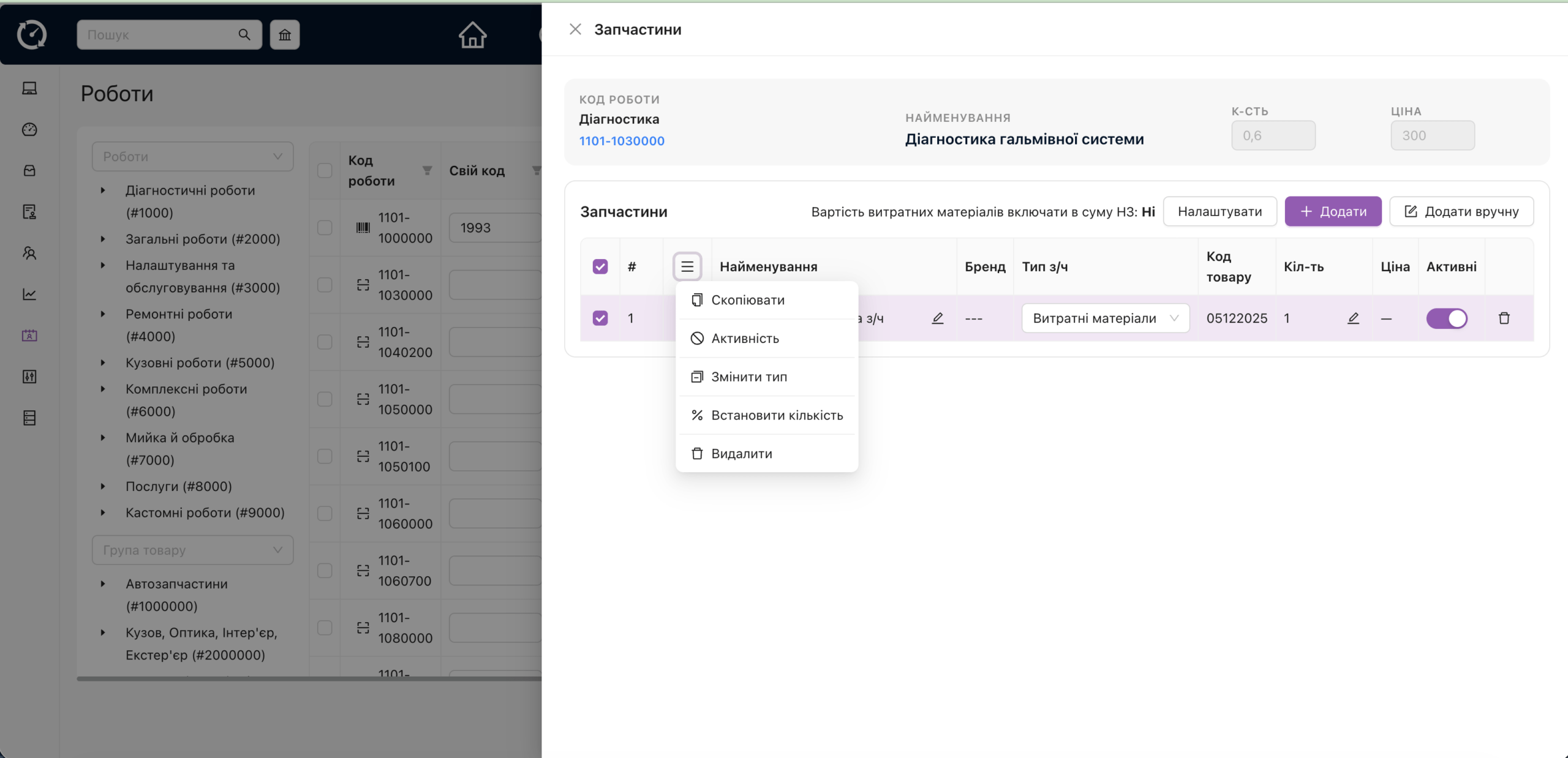 CARBOOK робить управління витратними матеріалами простим і гнучким, інтегруючи їх у весь цикл роботи автосервісу. Почнемо з основи — довідника робіт. Тут ви можете прикріпити витратні матеріали до кожної послуги: наприклад, до заміни оливи додати певну кількість моторного мастила з каталогу. Ключова фішка — вибір типу запчастини: “запчастина СТО” (з вашого складу, замовлено у постачальника), “витратні матеріали” (спеціальна категорія для дрібниць) або “запчастина клієнта” (якщо клієнт приносить своє). Це дозволяє точно розподіляти витрати та уникати плутанини.Довідник робіт – налаштування типу запчастини, яка буде додаватись разом з роботою.