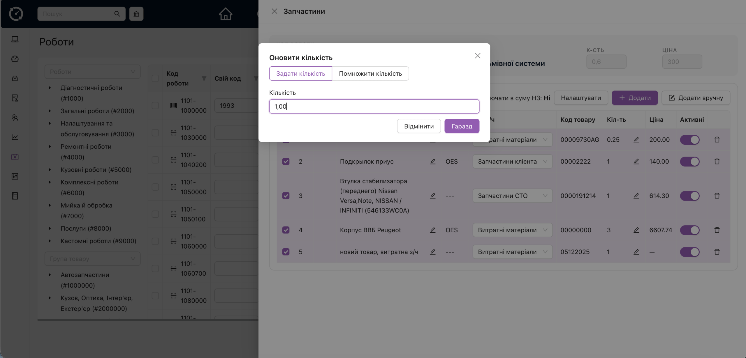 Довідник робіт – привʼязка з/ч – робота з кількістю.