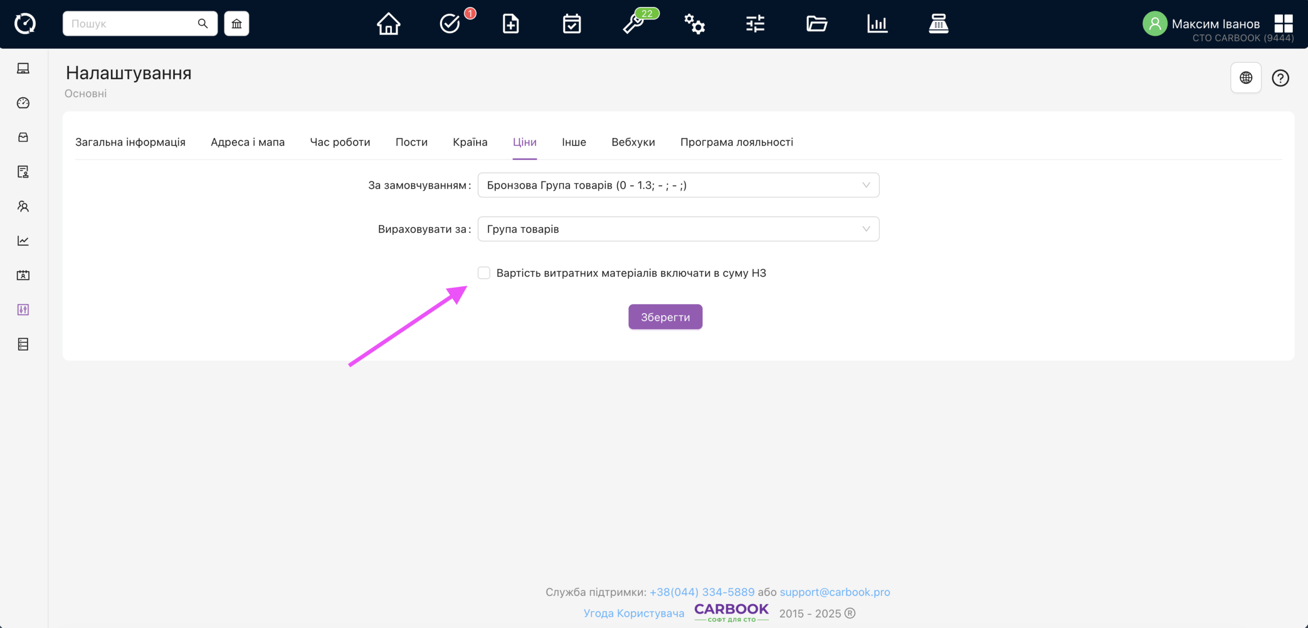 Щодо обліку в сумі н/з: витратні матеріали можуть включатися в загальну суму або ні — залежно від вашої політики. Налаштуйте це в “Налаштування СТО” → вкладка “Ціни” (“Вартість витратних матеріалів включати в суму НЗ”). Якщо не включати, поля цін стануть недоступними, а матеріали просто спишуться зі складу за кількістю з розрахунком за FIFO (first in, first out). Це ідеально для СТО, де дрібниці йдуть як “бонус” до послуги, але все одно контролюються.Вікно налаштування СТО - таб ціни – включати суму витратних з/ч в суму н/з чи ні.