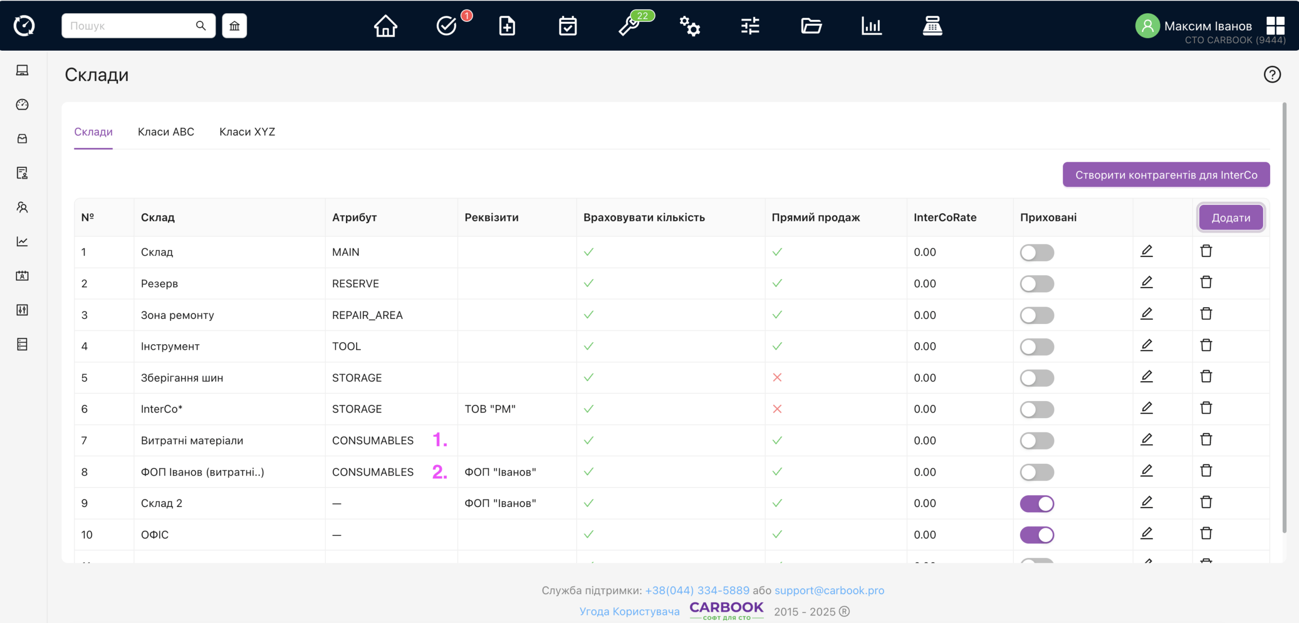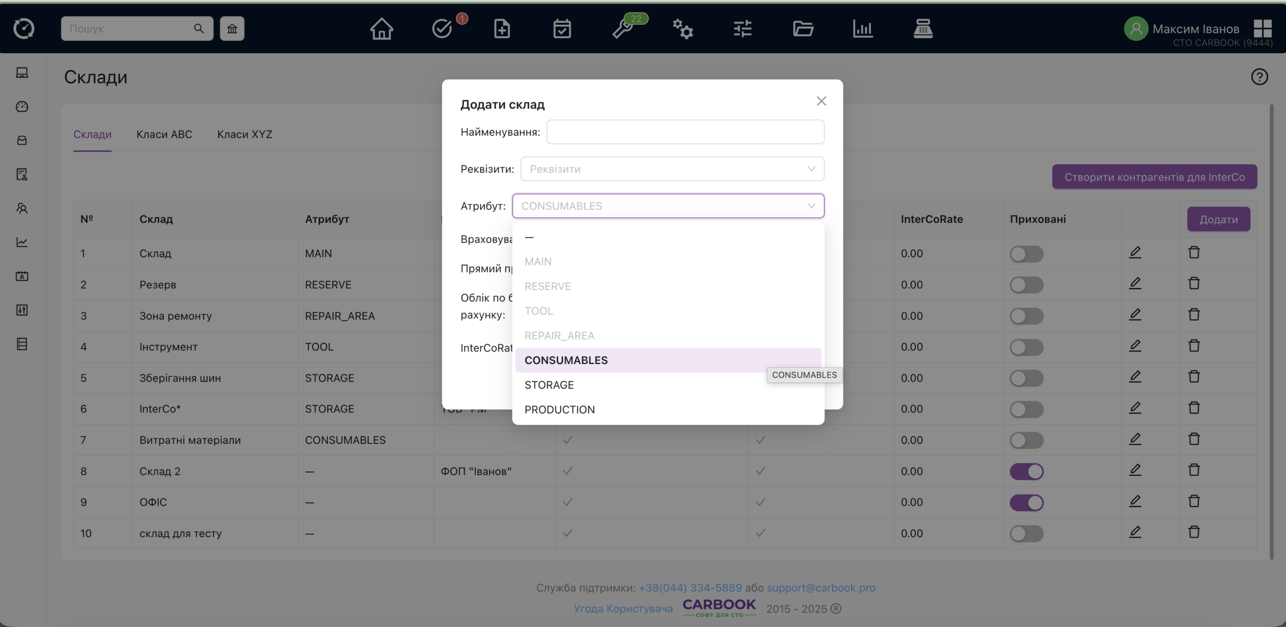 CARBOOK йде далі, пропонуючи розширені налаштування для професійного управління. Склади та резервування — це про порядок. Новий атрибут складу CONSUMABLES дозволяє виділити окремий склад для витратних матеріалів: зберігати, списувати та прив’язувати до реквізитів СТО. При додаванні матеріалів до н/з система автоматично резервує їх — з “рідного” складу СТО або першого з атрибутом CONSUMABLES. Забудьте про ручне бронювання: все відбувається миттєво, зменшуючи ризик “продати те, чого немає”.Вікно налаштування складів – нові атрибути для складів – зберігання витратних матеріалів.