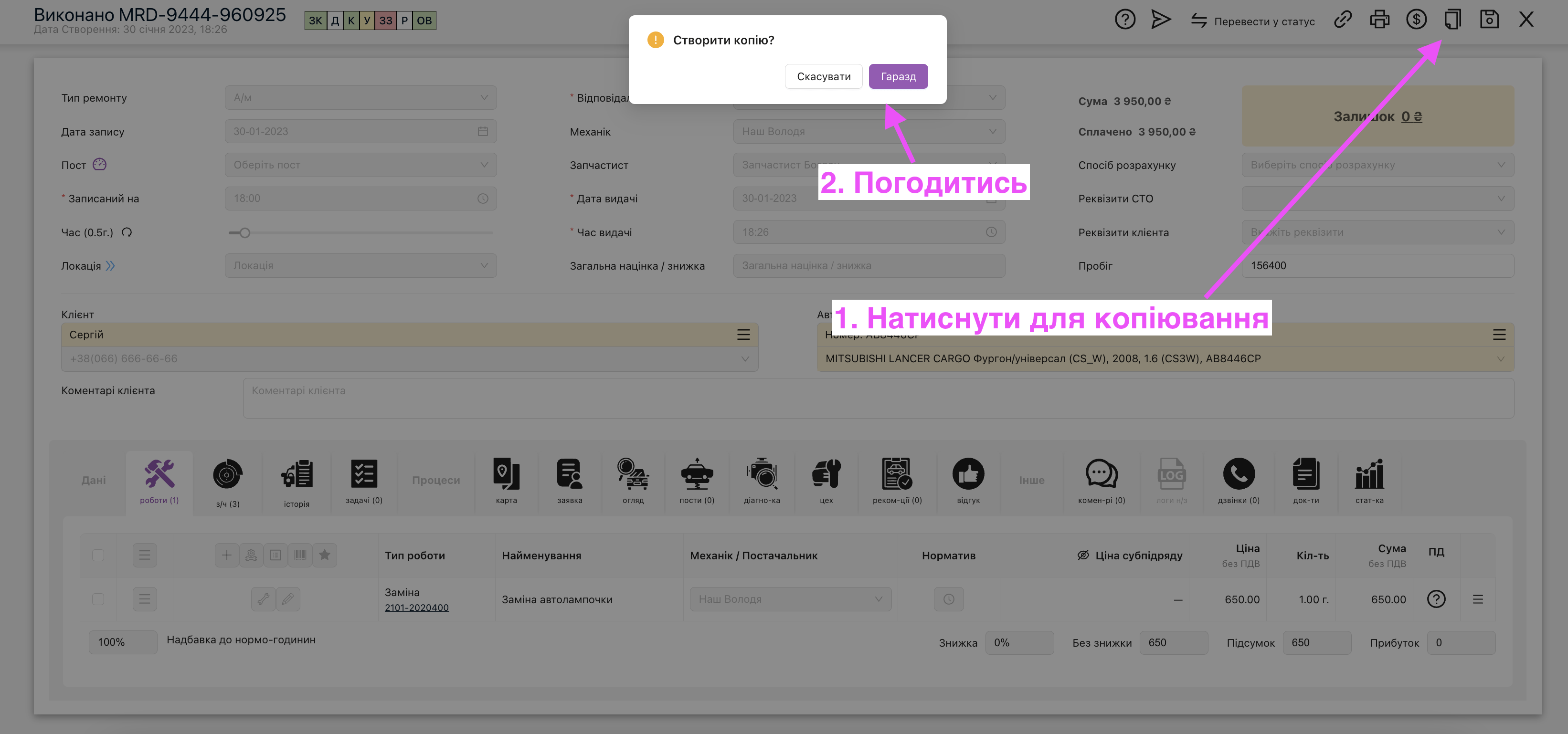 Таким чином буде створена копія цього наряд-замовлення. Перенесуться роботи, запчастини, виконавці, повністю копія замовлення, але з новим номером.