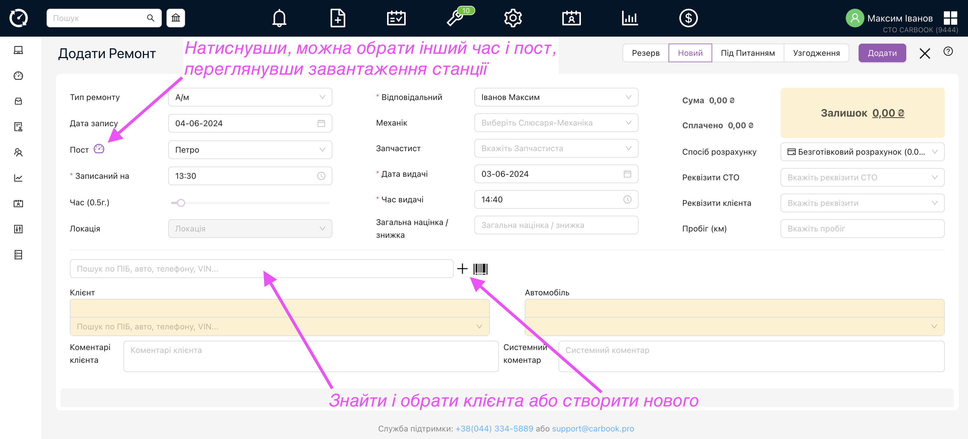 Так само тут на потрібному дні, натискаємо кнопочку “+” напроти необхідного часу. У відкритому вікні, заповнити необхідні поля. Клієнта можна знайти за номером телефону, автомобіля, vin або створити нову картку клієнта і додати його в наряд-замовлення.