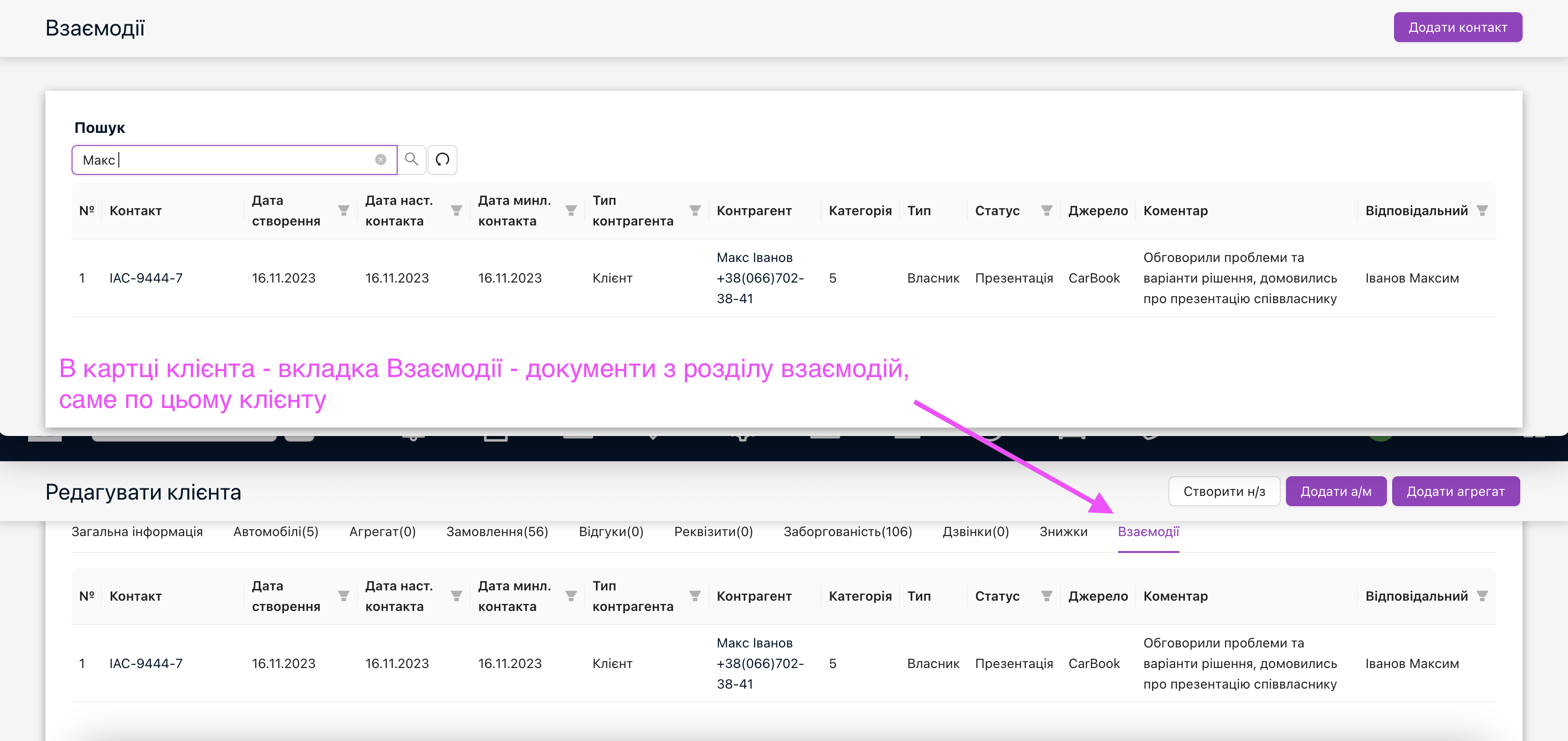 Взаємодії – список документів IAC, в якому відображаються поточні статуси кожного документа, дата створення, ПІБ, дати минулого та майбутнього контакту, а також коментар з останнього контакту з контрагентом. Доступне поле пошуку та фільтрація для пошуку необхідної взаємодії. Кожна взаємодія з контрагентом, зберігається в документі з типом IAC.