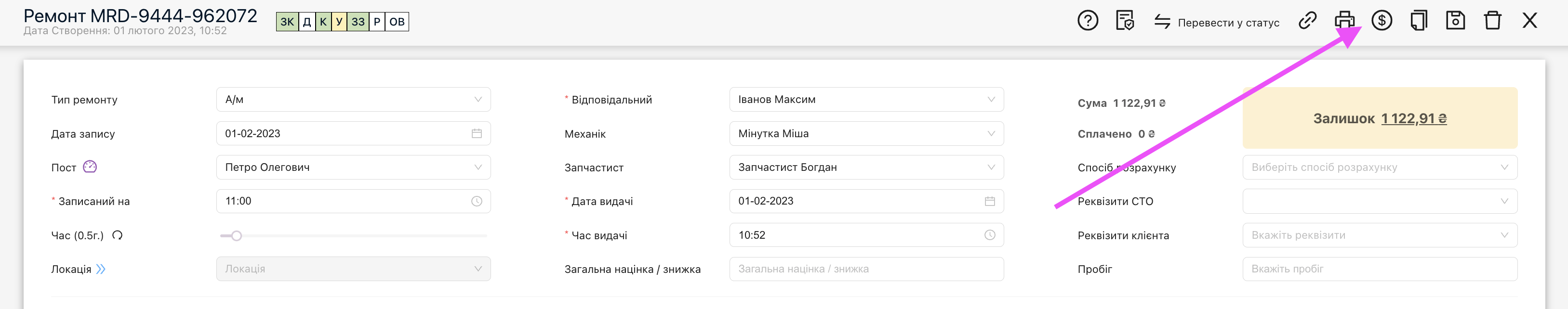 Для початку, потрібно створити наряд-замовлення та заповнити необхідні поля, щоб перевести наряд-замовлення в статус “Запис” або навіть “Ремонт“.