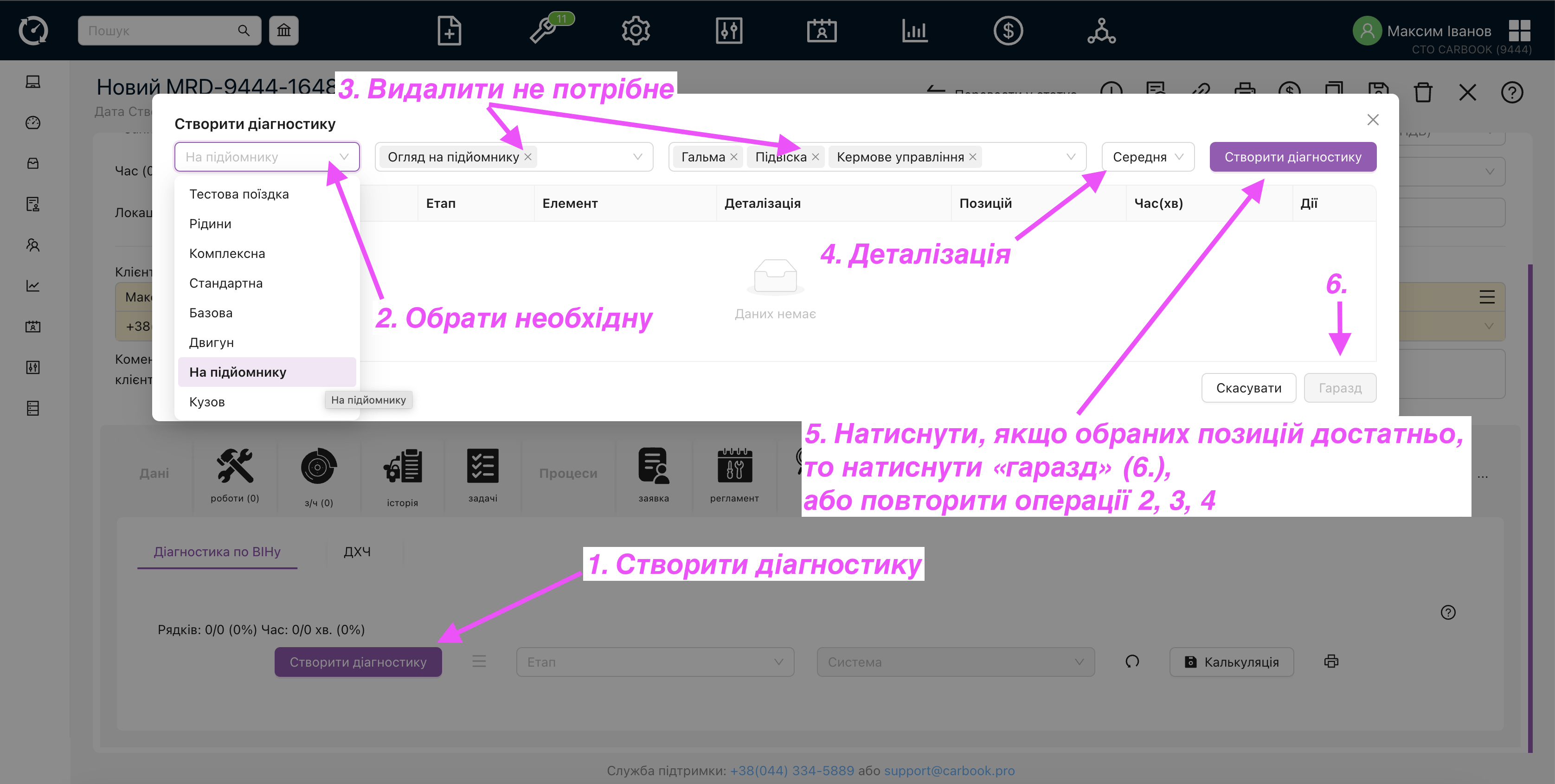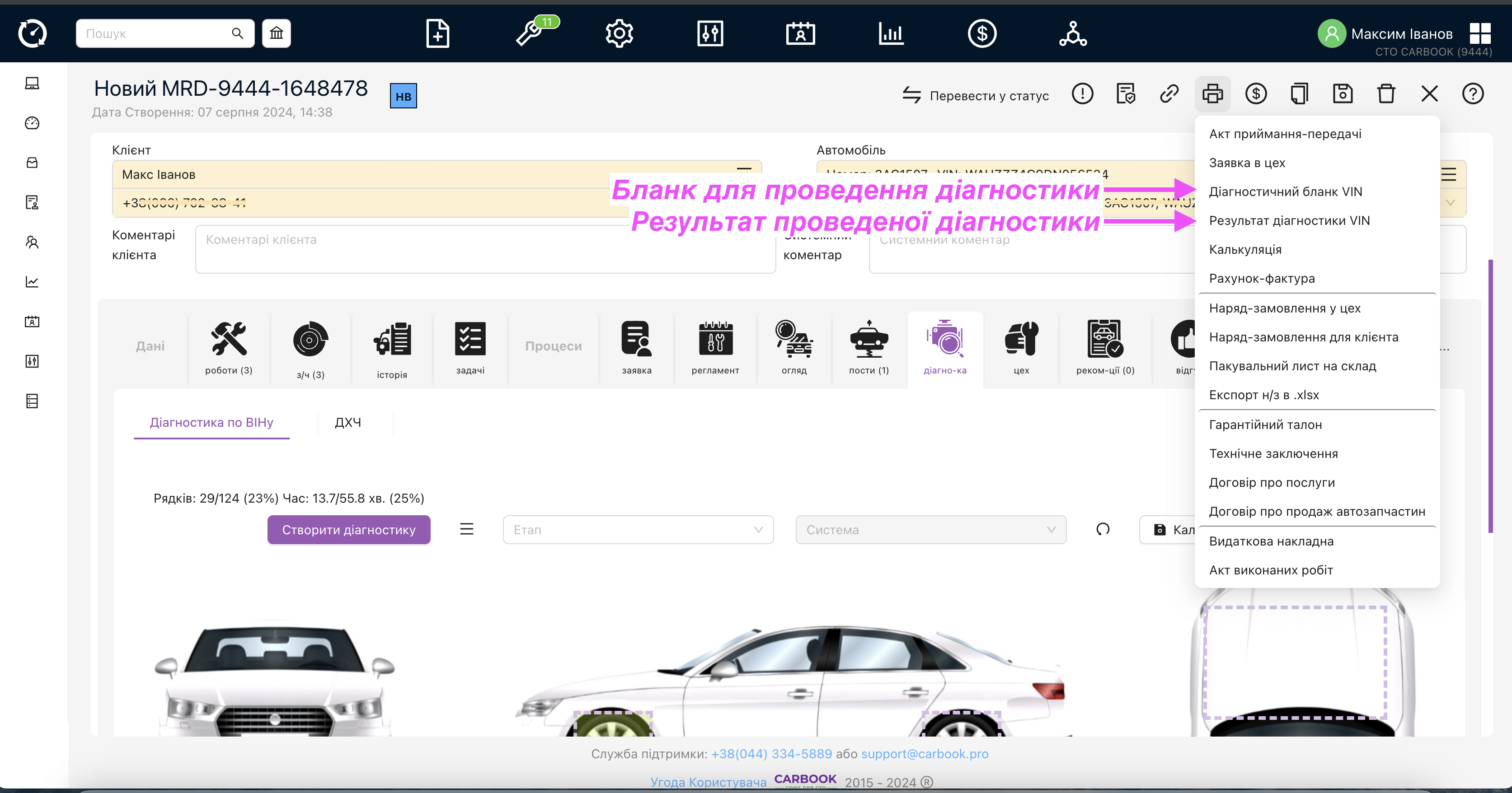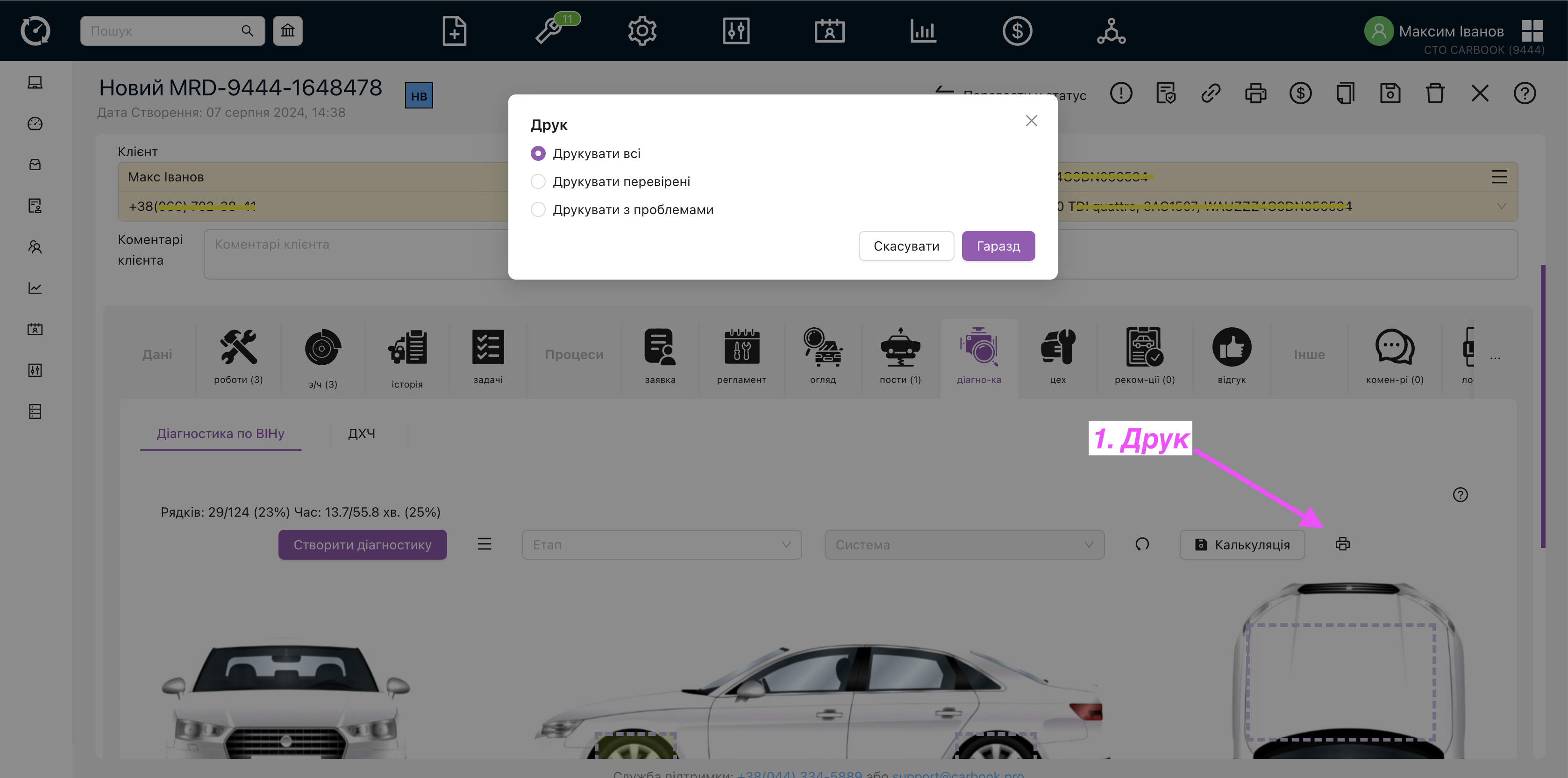 Далі продовжити, як і в легкових авто, проходження діагностики та друк бланків та додавання робіт до наряд-замовлення.