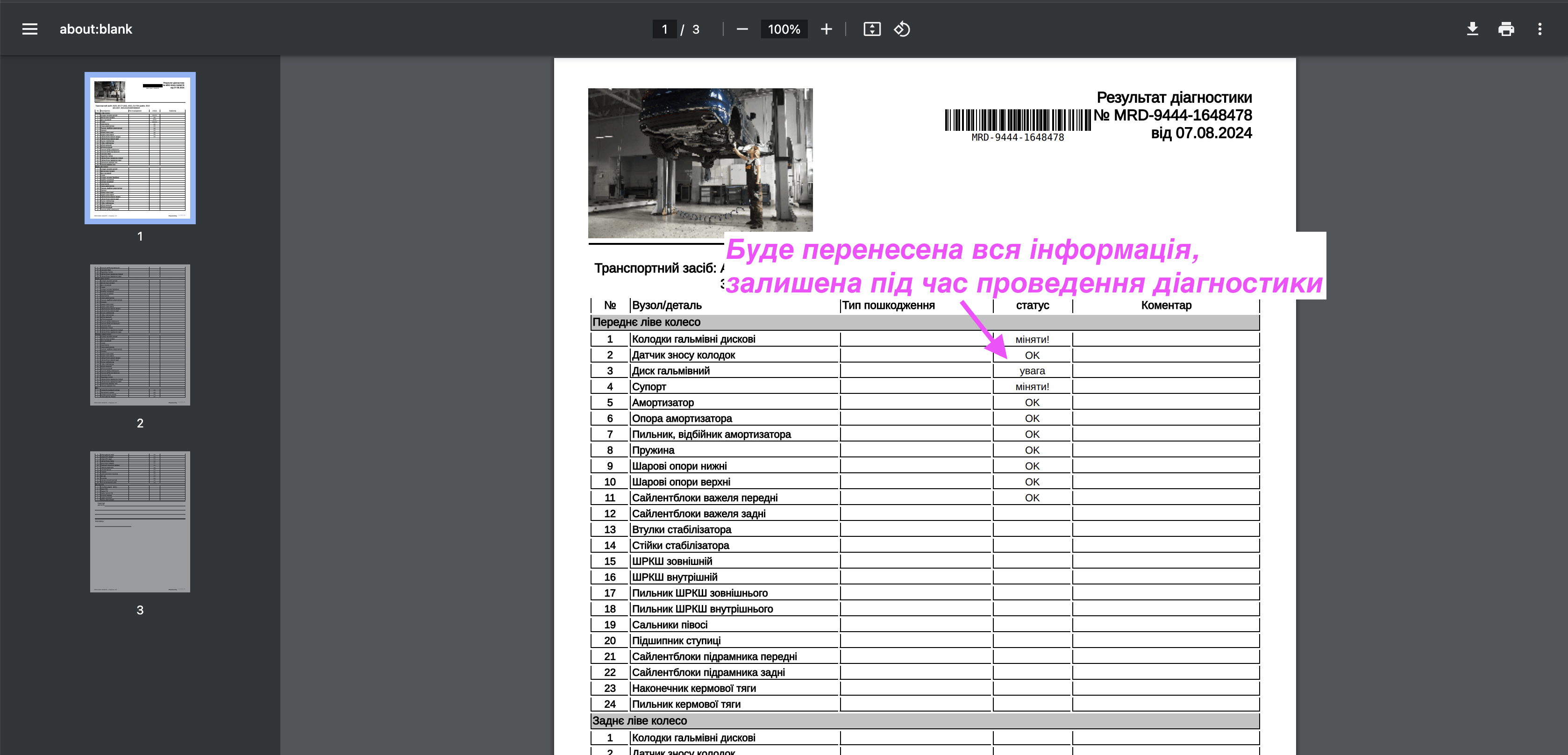 Після того, як перевірили в цьому вікні те, що ми позначали проходячи діагностику, натискаємо кнопку “гаразд” і система автоматично додасть ці роботи та запчастини до наряд-замовлення. В системі є можливість роздрукувати бланк для діагностики офлайн або результат вже проведеної діагностики.