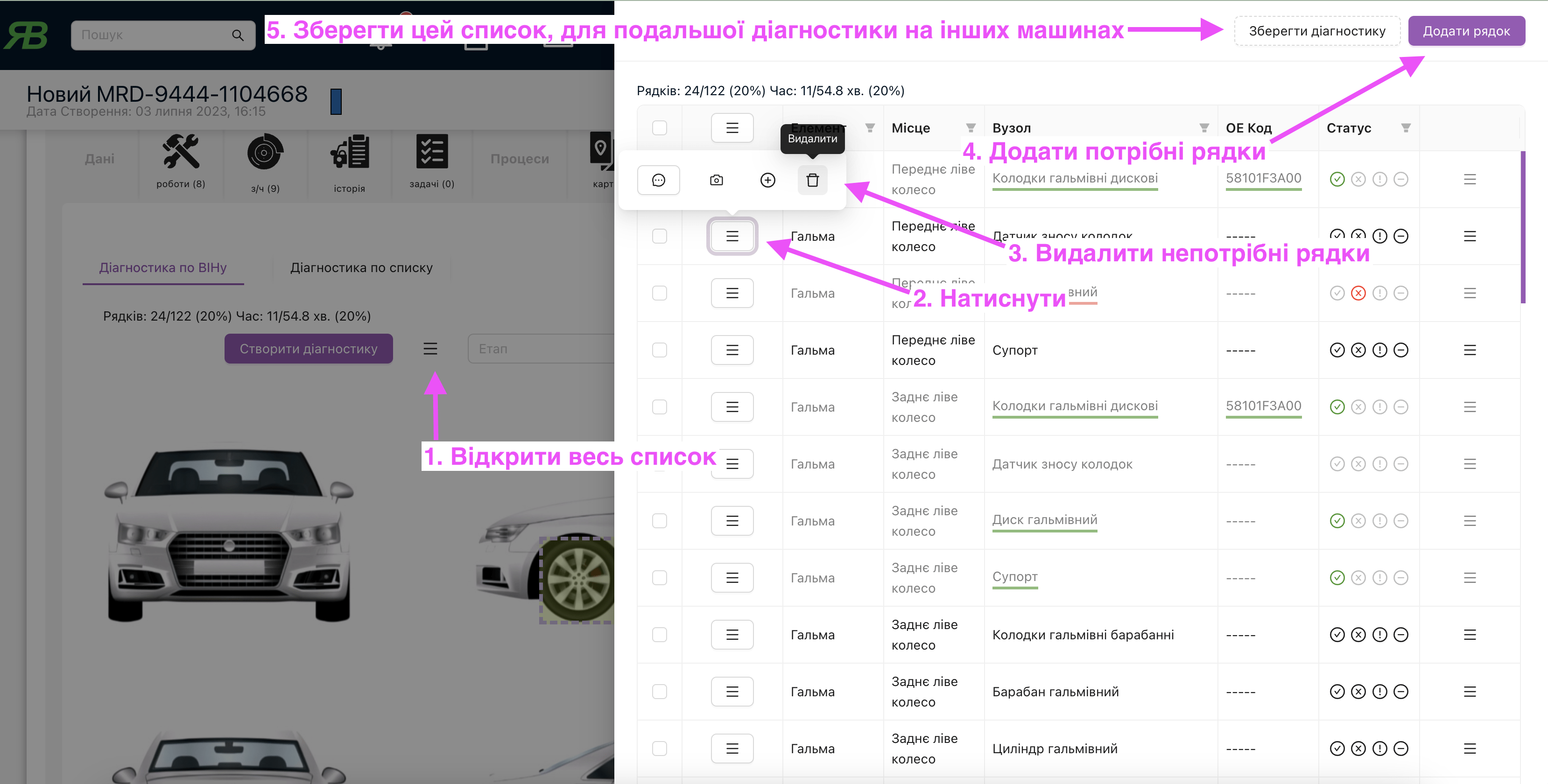 Праворуч від схеми ДХЧ, є список, який наповнюється відповідно до пройдених елементів схеми. В списку є можливість змінити статус, натиснувши на іконку статусу і є іконка видалити. Іконка видалити видаляє рядок елемента зі статусом і прибирає статус зі схеми ДХЧ в цьому елементі.Можливість редагування результату діагностики ходової частини.