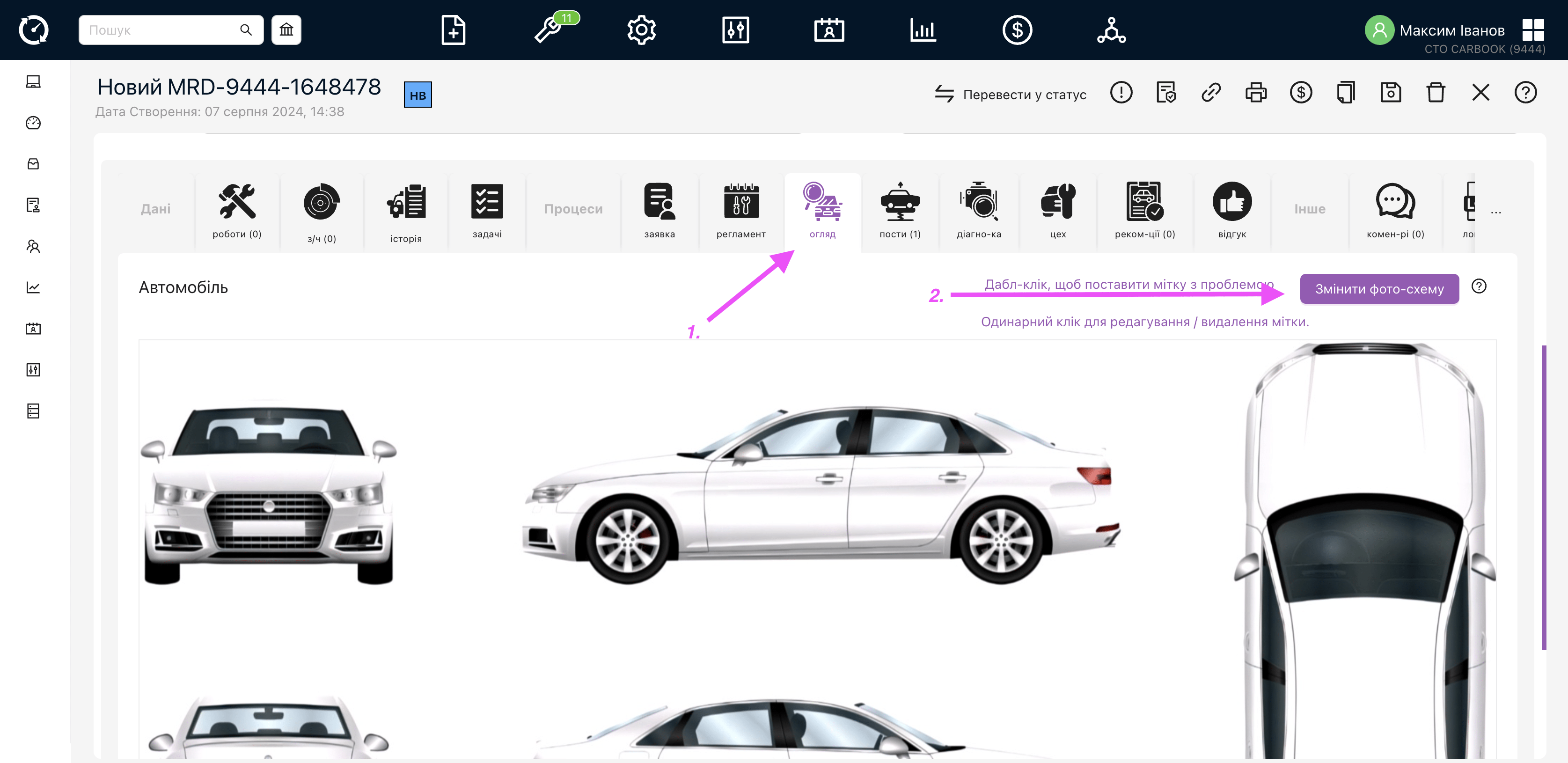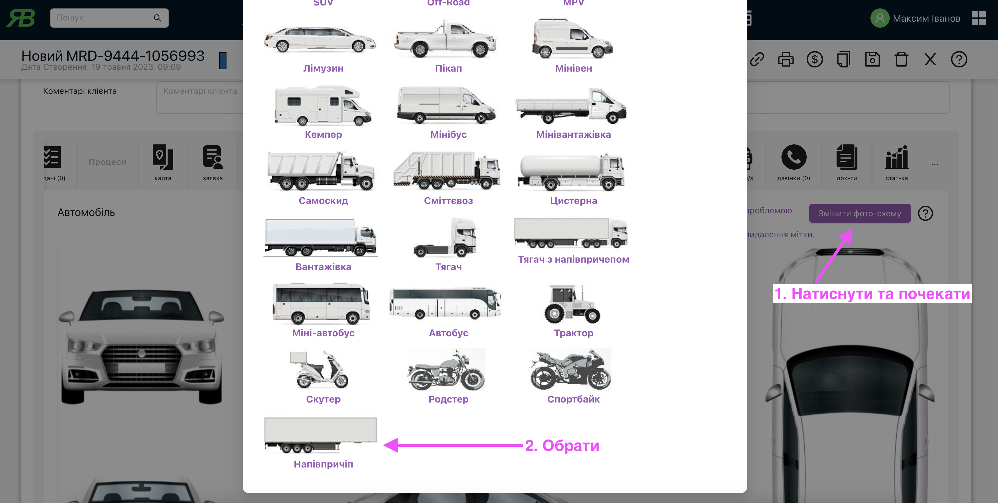 Отже, перший крок, необхідно обрати правильний тип авто, проводячи огляд, це повпливає на доступні типи діагностики. Для цього зайти в таб “Огляд”, далі кнопка “Змінити фото-схему”, якщо потрібно.