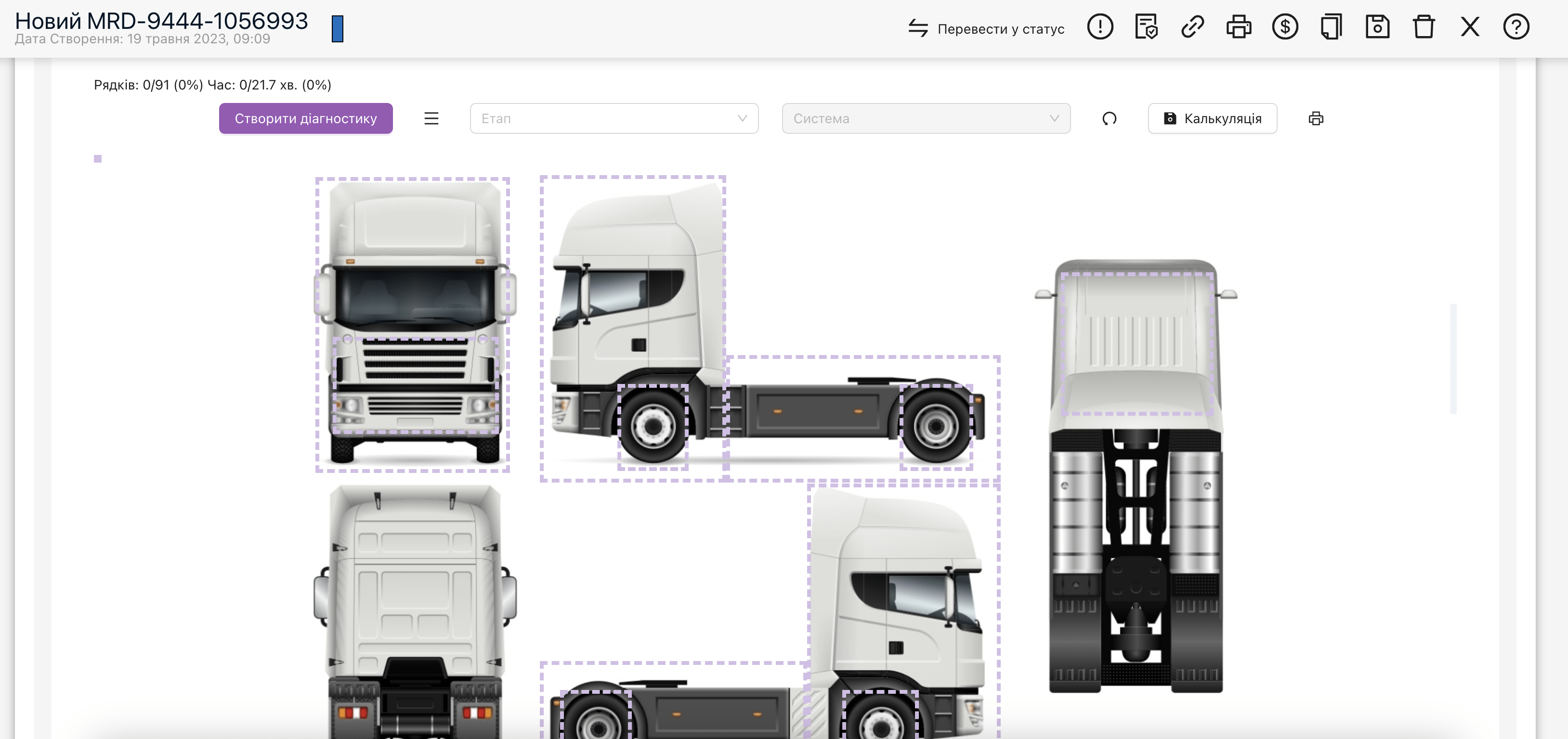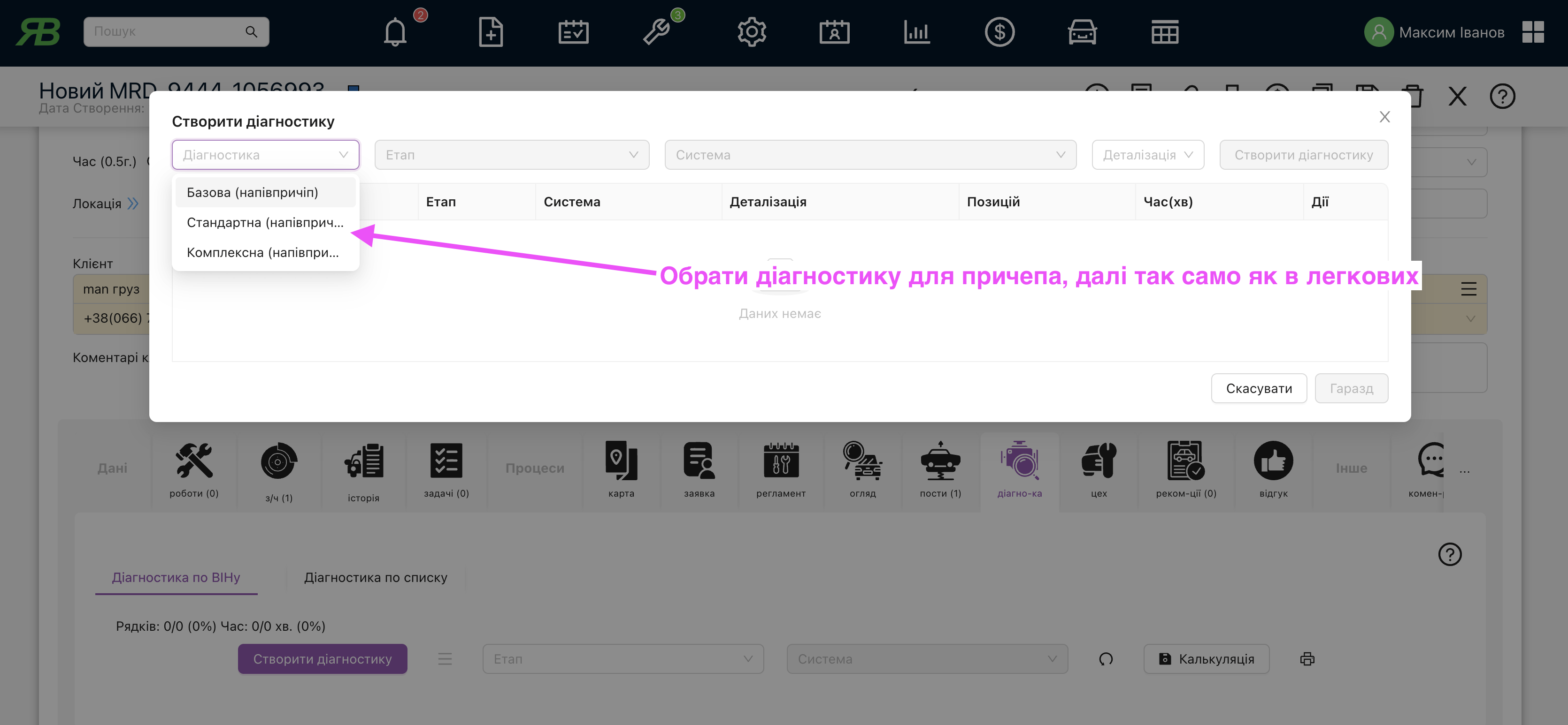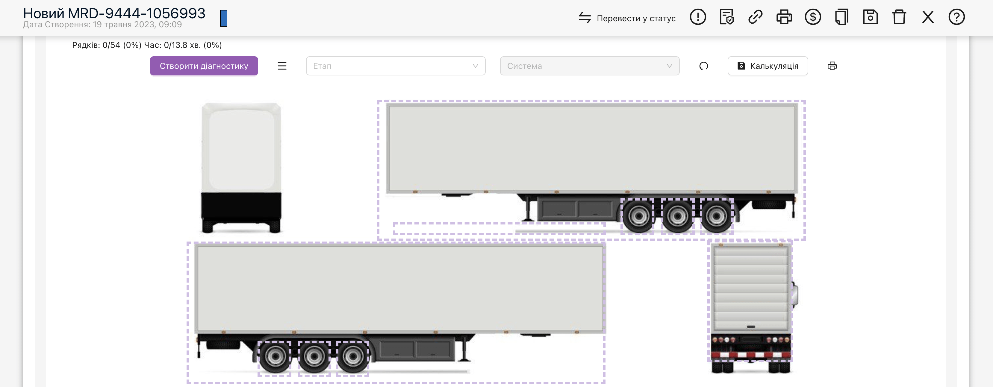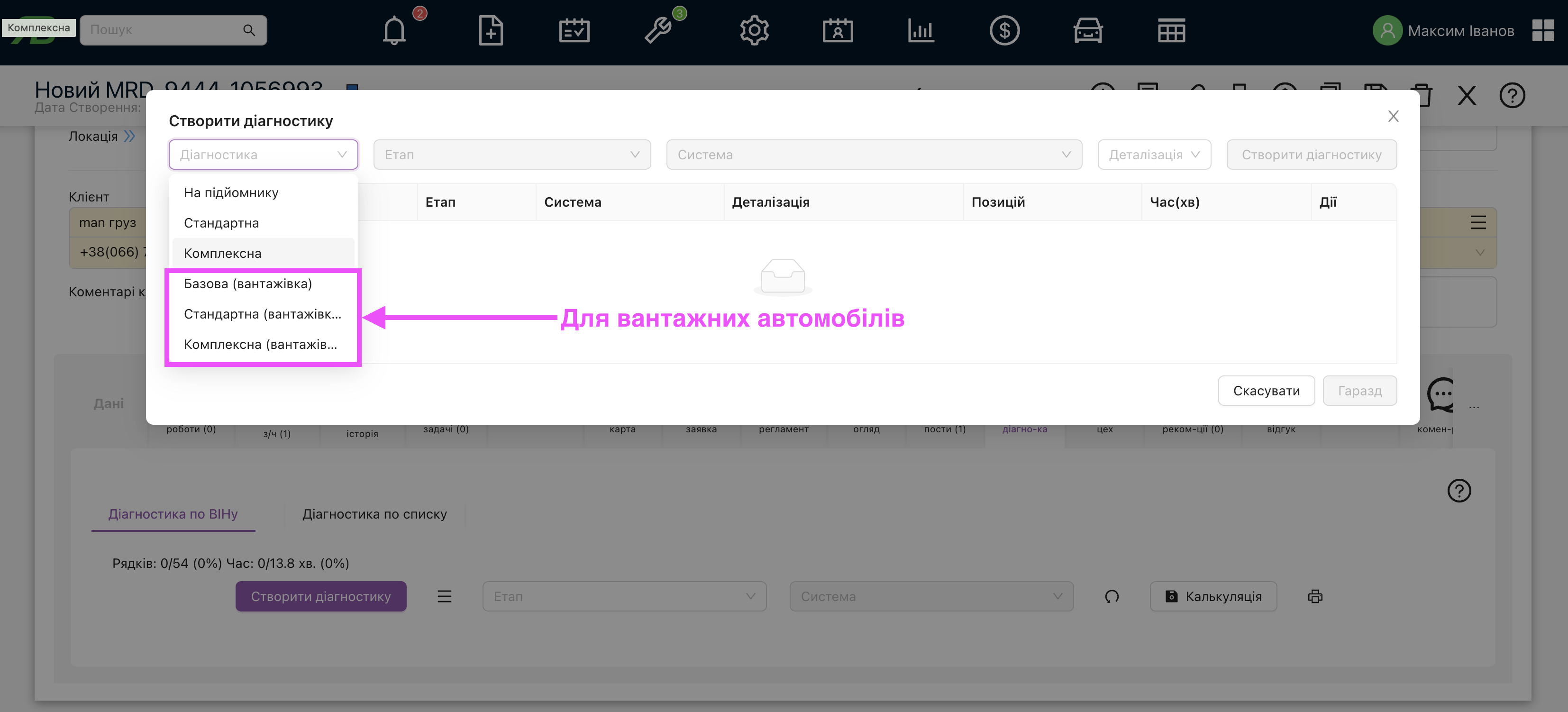 Для проведення діагностики вантажному автомобілю, треба обрати в таб “Огляд”, вантажний автомобіль, тягач чи тягач з причепом (як це було описано вище). Натиснути кнопку “Зберегти” в шапці наряд-замовлення. Далі перейти у вкладку діагностика та обрати відповідний план.
