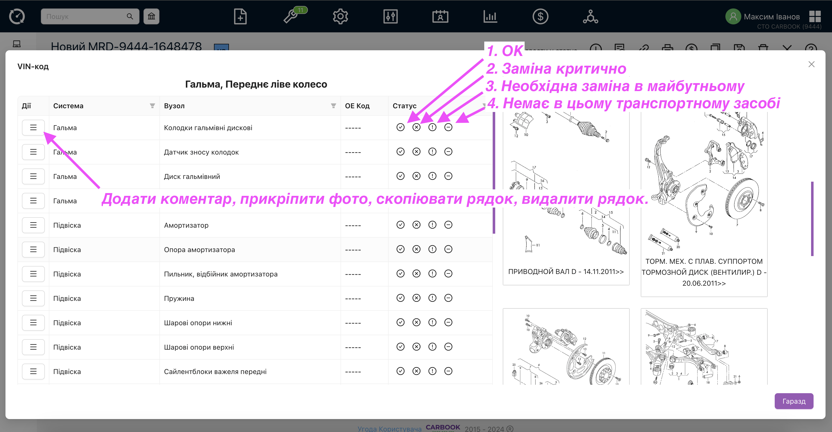 Ось так виглядає вікно, після натискання на “ліве переднє колесо”. Можна фільтрувати по системі, вузлу чи статусу. Також можна залишати коментар, чи копіювати рядок або видалити взагалі цей пункт. Залежно від стану деталі, обираємо статус — їх 4 варіанти: “ОК”, “Критично”, “Необхідна заміна в майбутньому” та “Немає в цьому авто”.