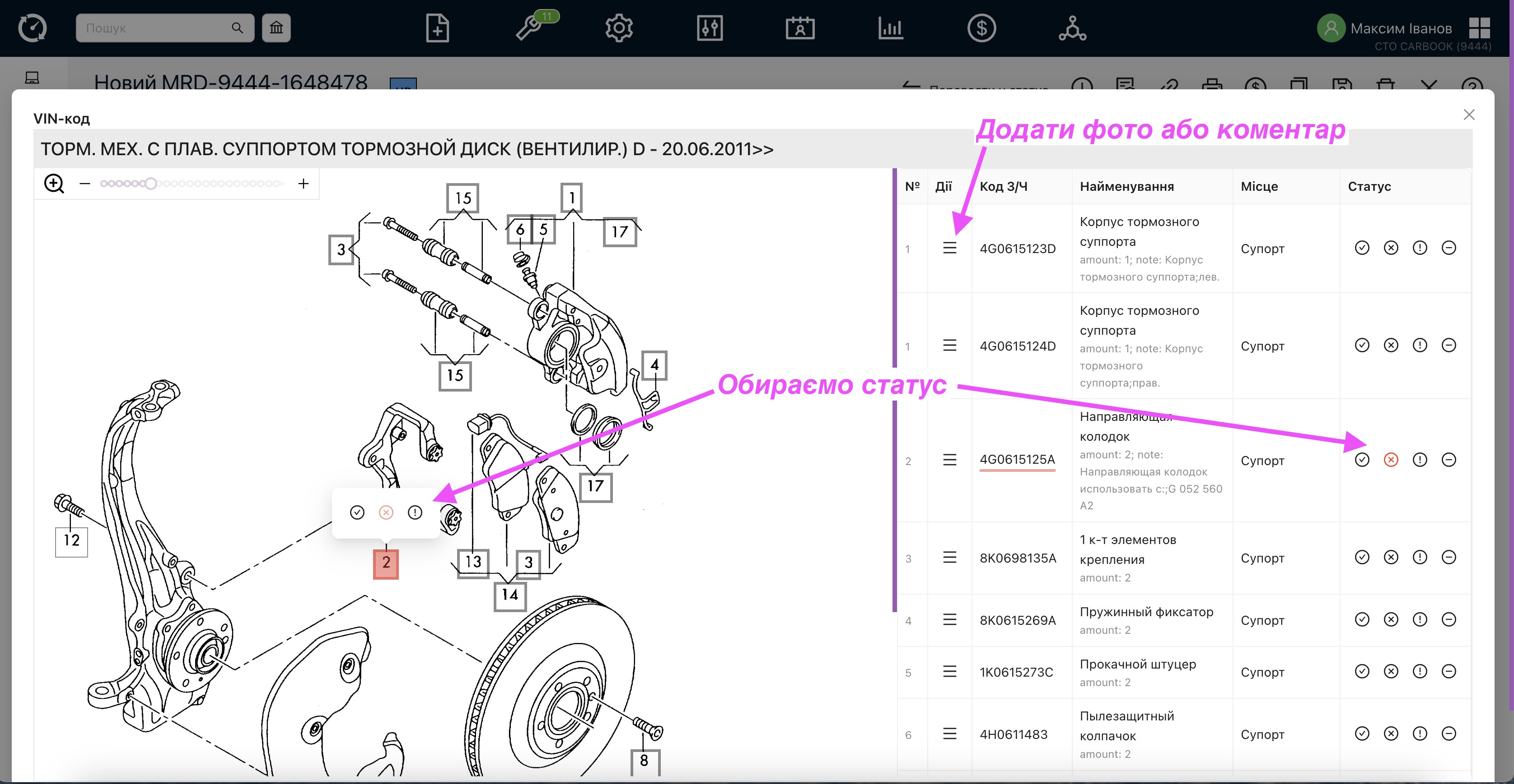 Таким чином, можна провести діагностику та отримати готові коди запчастин та відповідні роботи до них прямо в наряд-замовлення.