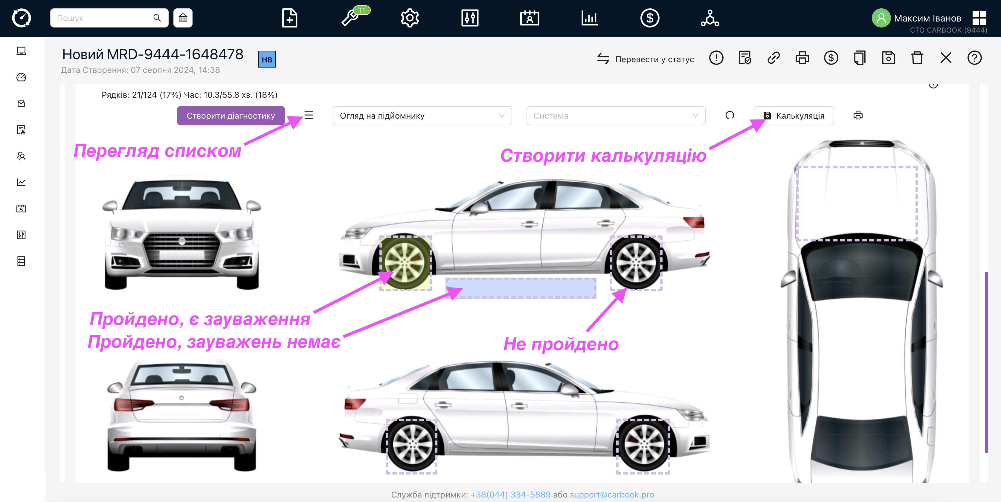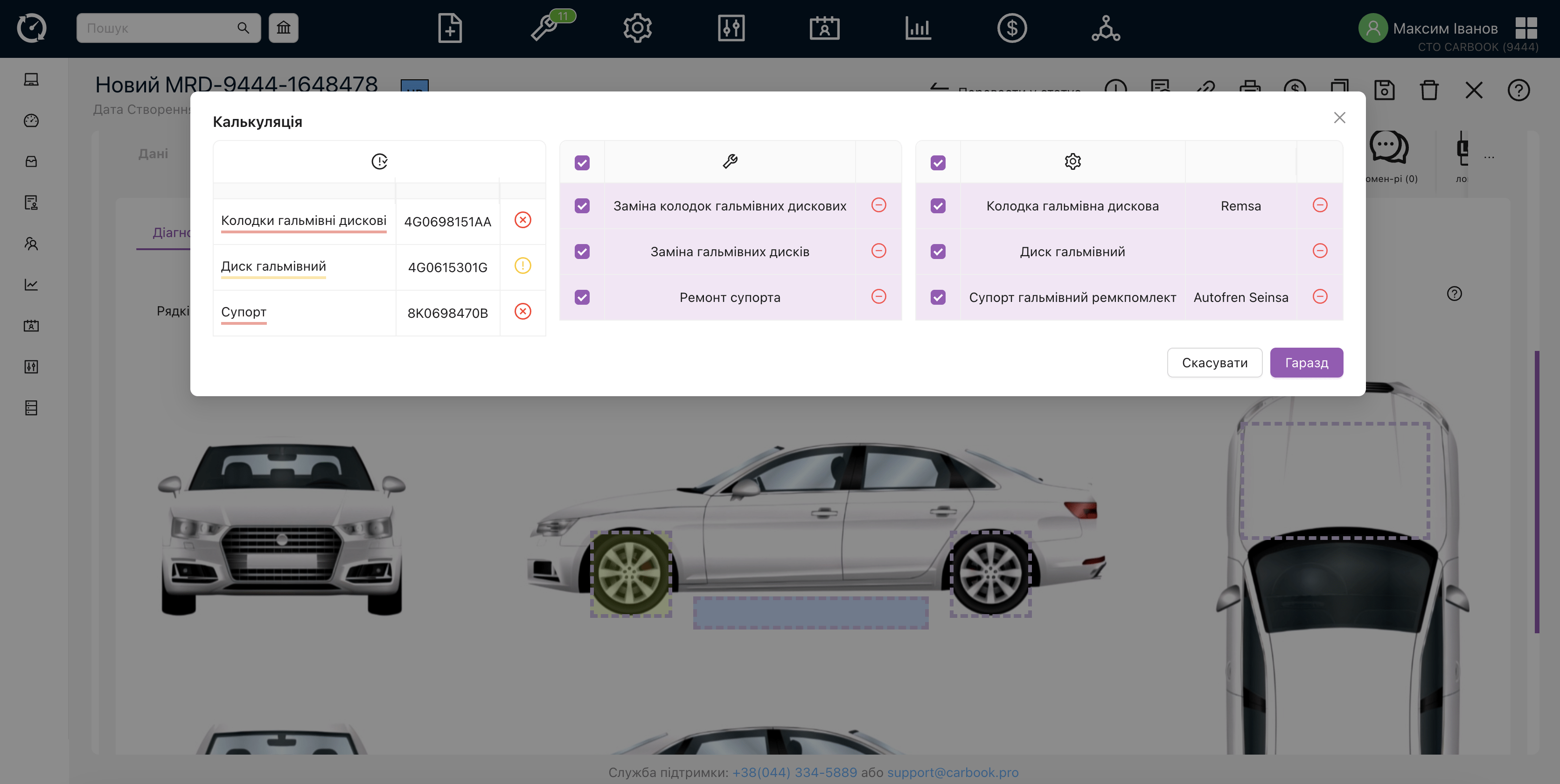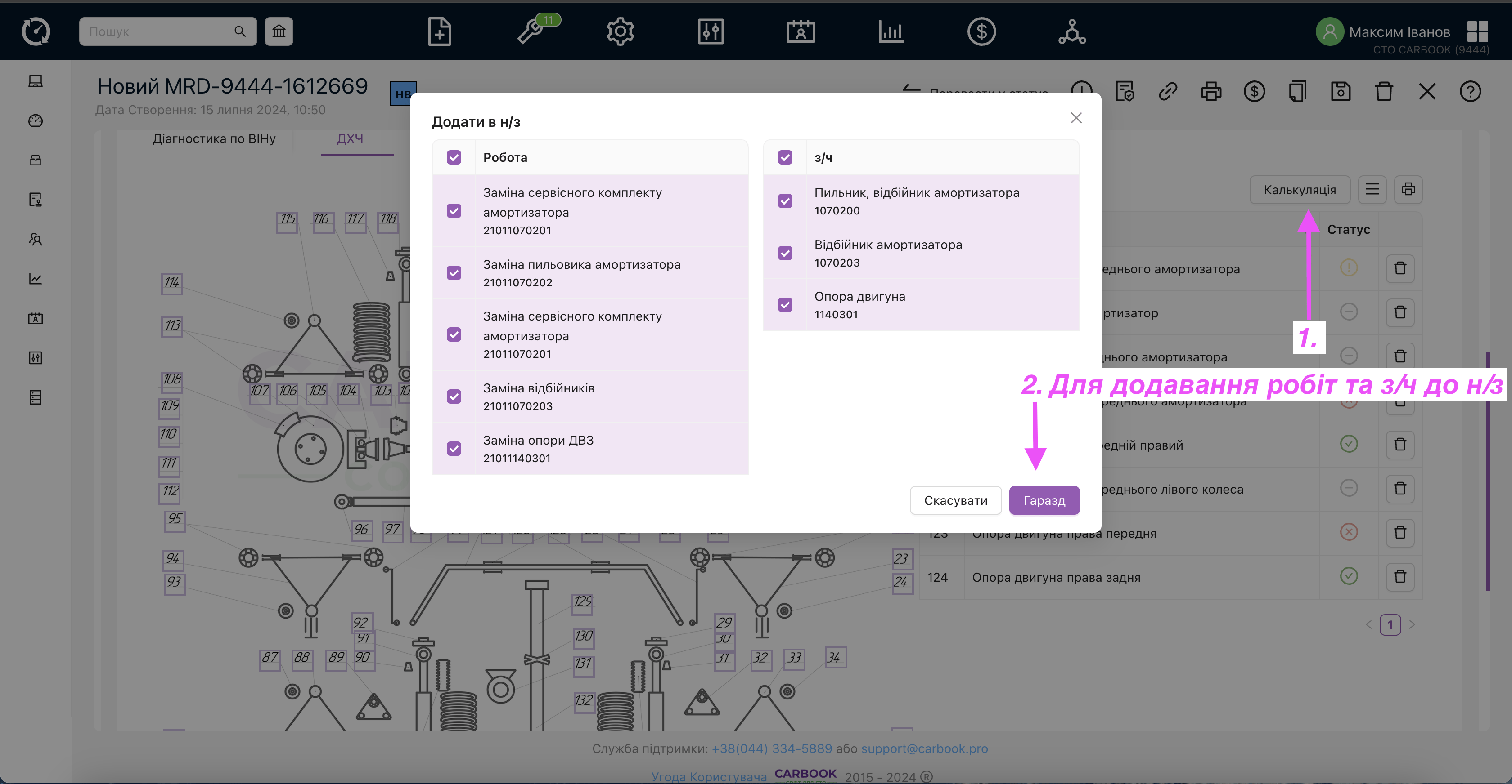 Після проходження запланованої діагностики, можемо роздрукувати все результат, за допомогою кнопки принтер, біля калькуляції. Щоб створити калькуляцію та перенести роботи й запчастини до н/з – натисніть кнопку “Калькуляція”.