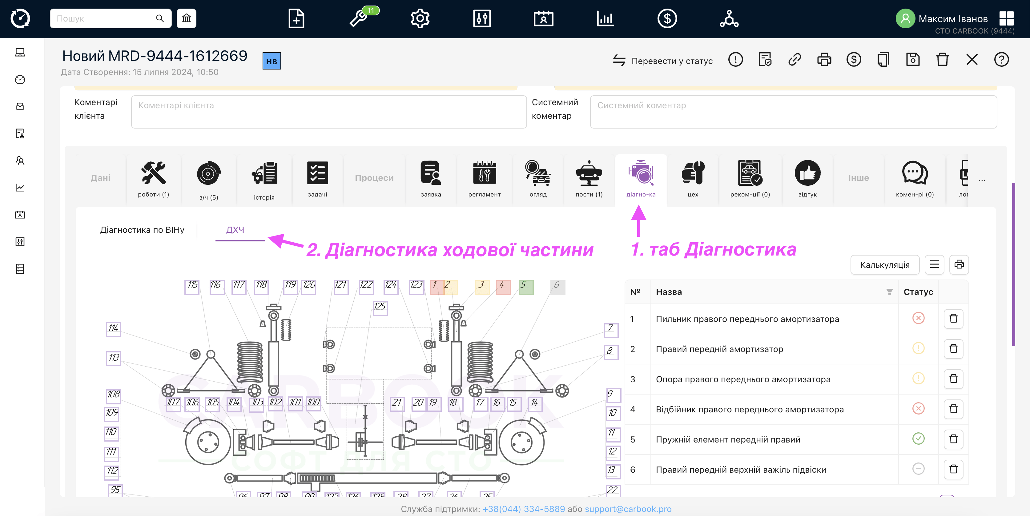 Для того, щоб провести діагностику ходової частини, необхідно створити н/з або перейти в створене, далі перейти в таб. Діагностика й обрати ДХЧ — діагностика ходової частини. Далі можна робити відмітки на потрібних елементах, після чого праворуч буде занесено в список пройдені позиції з дублюванням статусу кольором на відповідному номері.