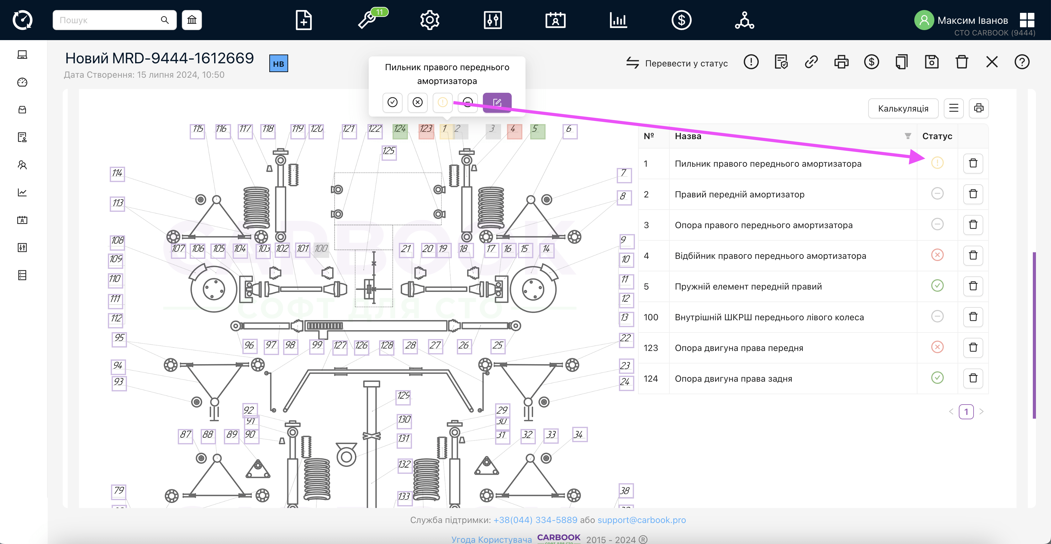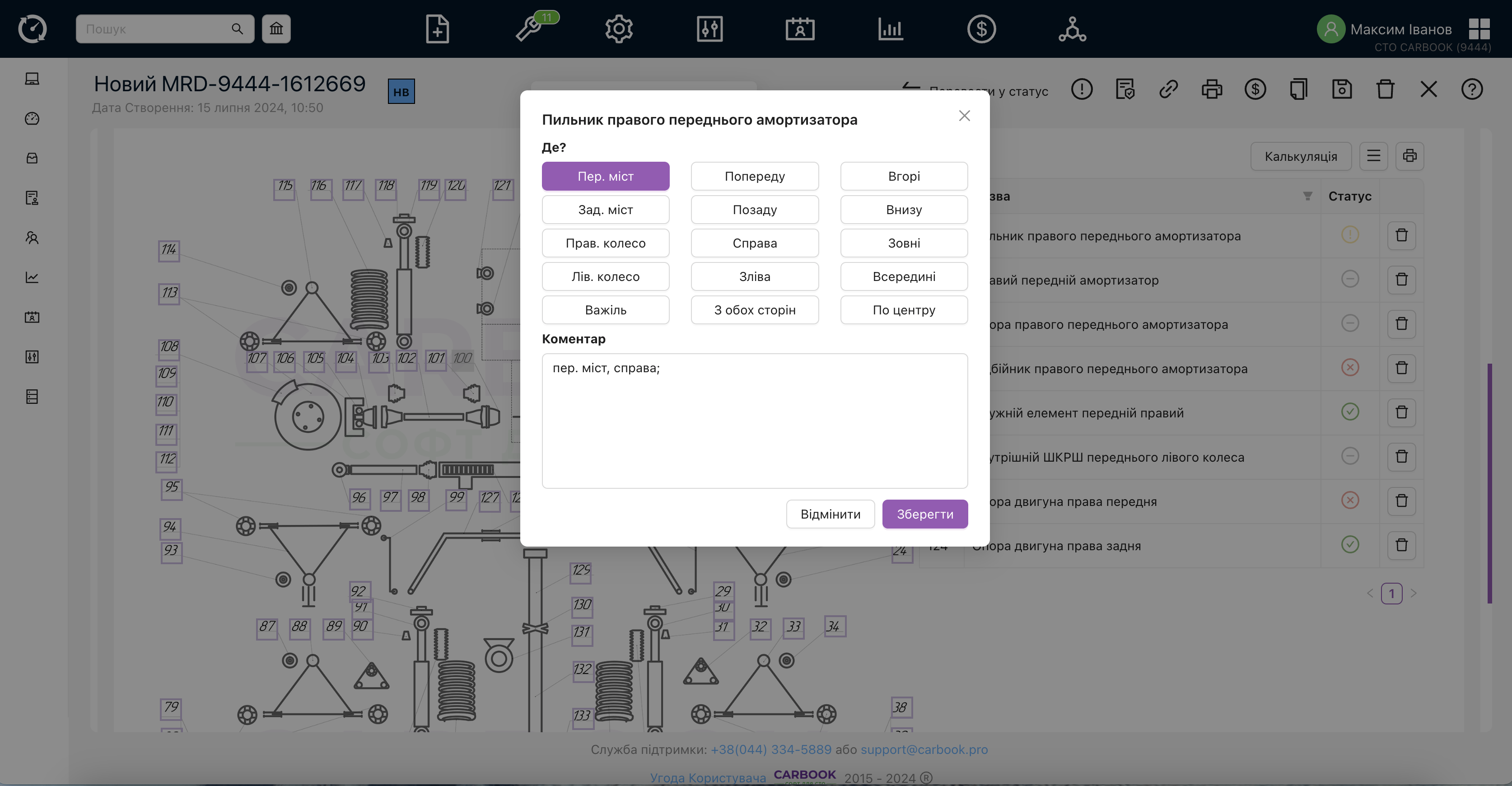 В кожному елементі, прописаний коментар з місцем розташування елемента, наприклад, “Пильник правого переднього амортизатора” – відповідно, якщо натиснути на іконку коментар, то його можна побачити та за необхідністю змінити. При створенні калькуляції, інформація про місце розташування буде перенесена в таб “Роботи”  та таб “Запчастини”.Коментарі до елементів при проведенні діагностики ходової частини