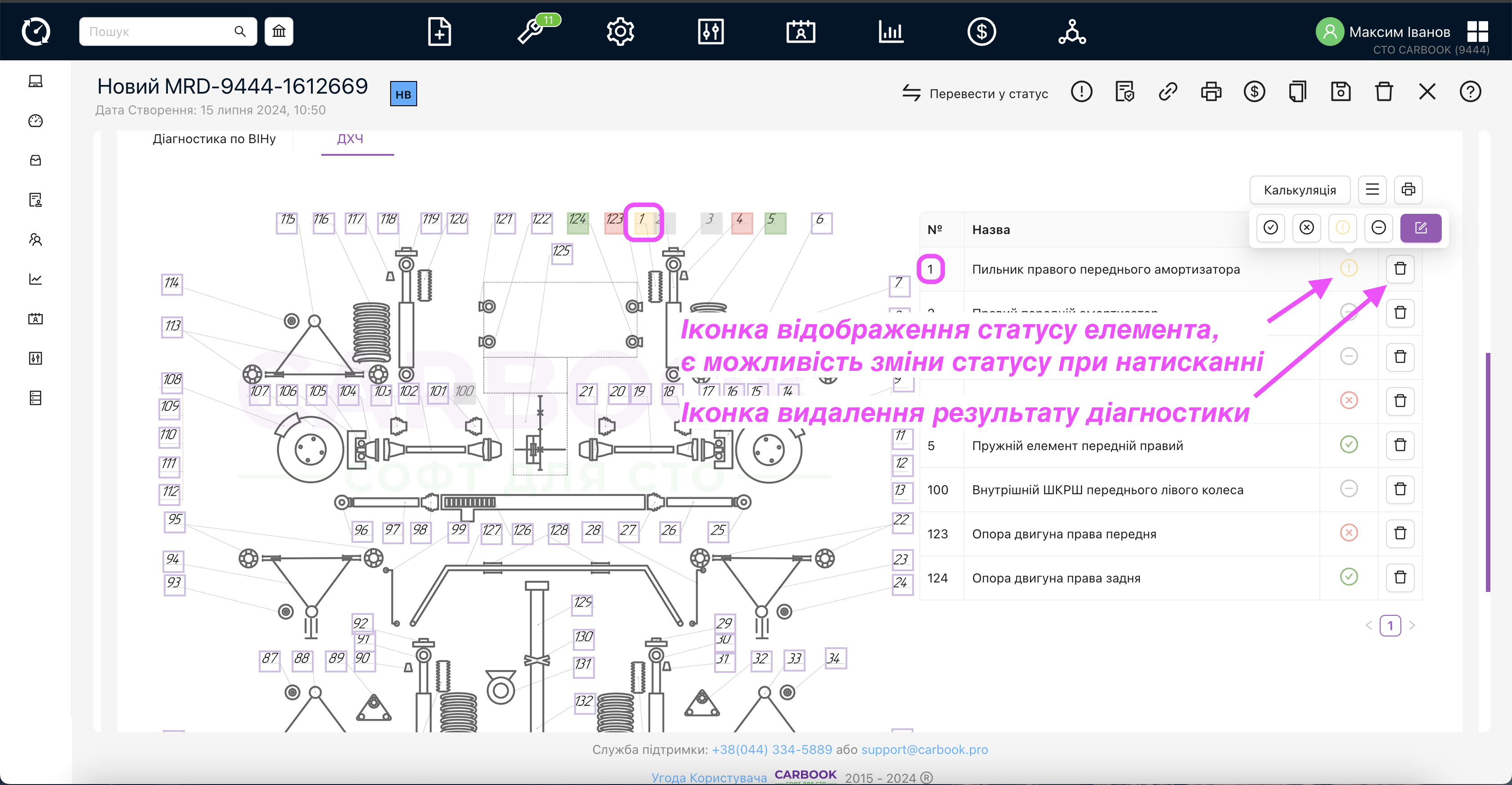 Для кожного елемента, є відповідний номер, при наведенні на який, можна проставити статус “галочка” – все добре (зелений колір), “хрестик” – Термінова заміна (червоний колір), “знак оклику” – Не термінова заміна (жовтий колір) та “тире” – відсутній в цьому транспортному засобі (сірий колір). Позначки стану деталі при проведенні діагностики