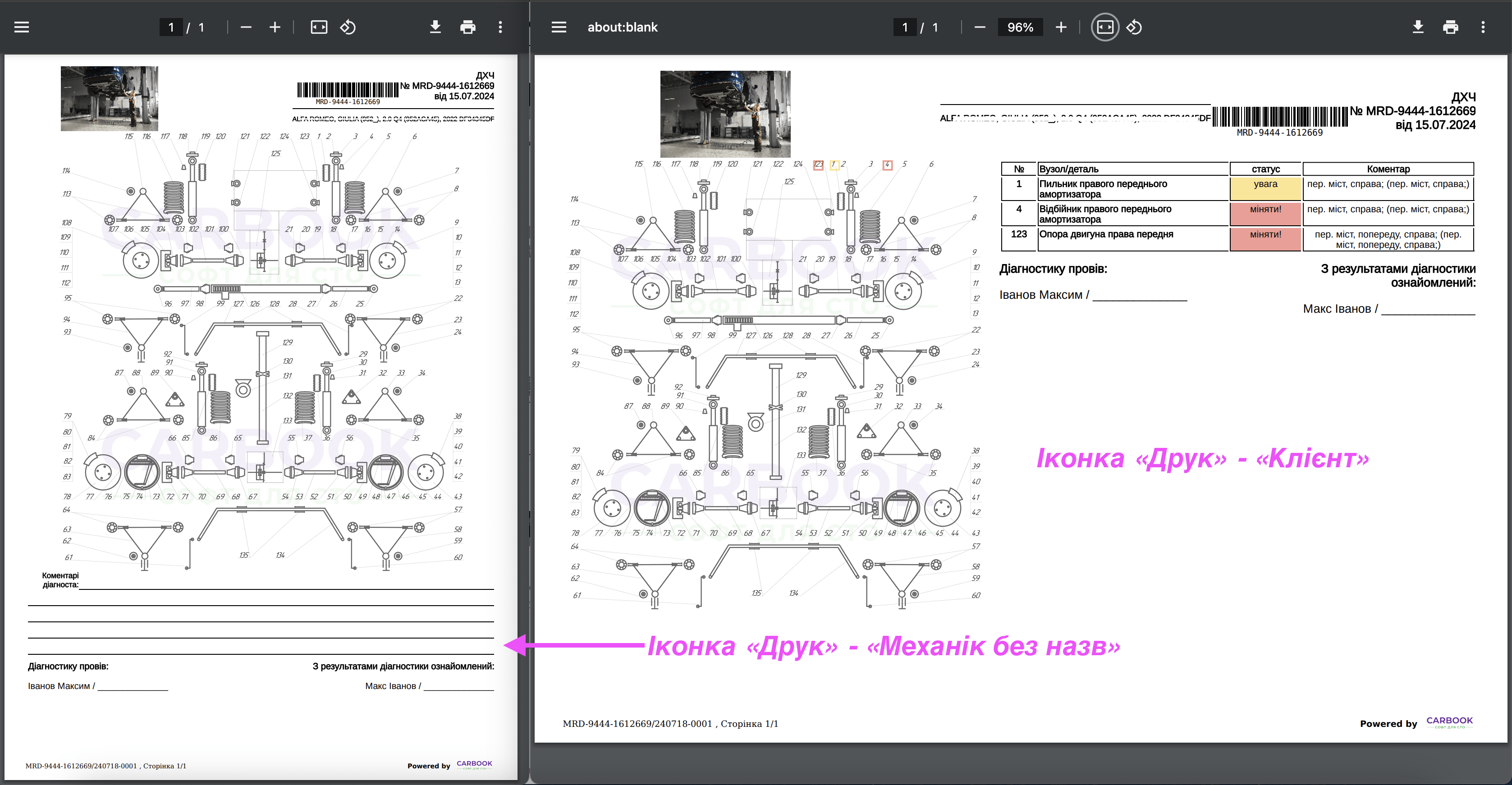 Іконка друк, в табі ДХЧ (принтер), дозволяє надрукувати варіант для діагностики офлайн – “Механік без назв”, варіант пройденої діагностики з результатами – “Клієнт” та спеціальний документ “Механік з назвами” – з зображенням схеми та назвами всіх позначень на ній. Приклад, друку результатів ДХЧ.