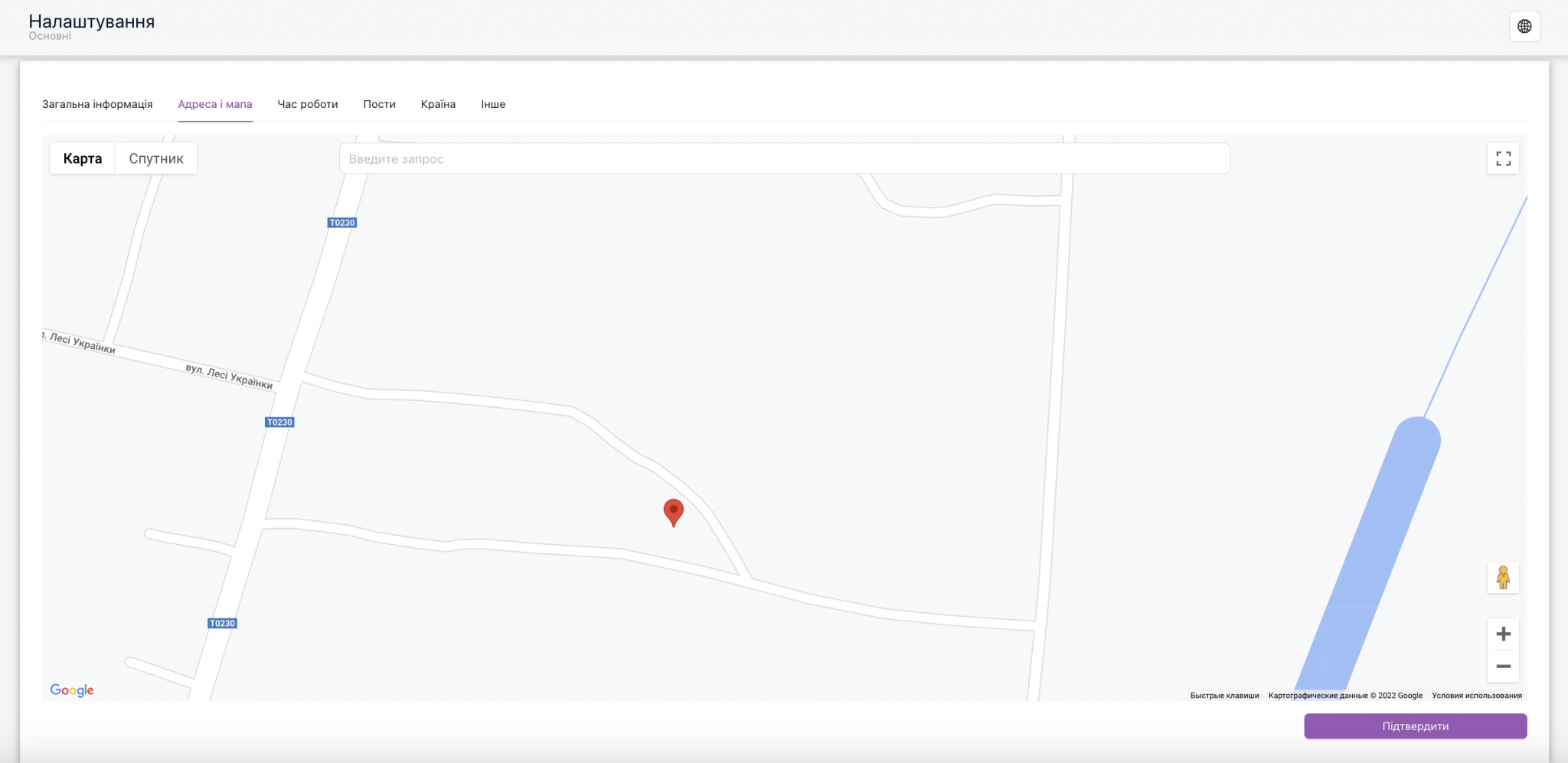 Переходимо у меню, ліворуч зверху та обираємо “Довідники та налаштування” вкладка “Налаштування СТО”, далі “Адреса і мапа” потрібно вказати точну адресу вашого СТО, для того, щоб вас змогли знайти клієнти. Можна, як вписати так і вказати конкретну точку на карті, для цього обираємо місце і натискаємо “Підтвердити”.