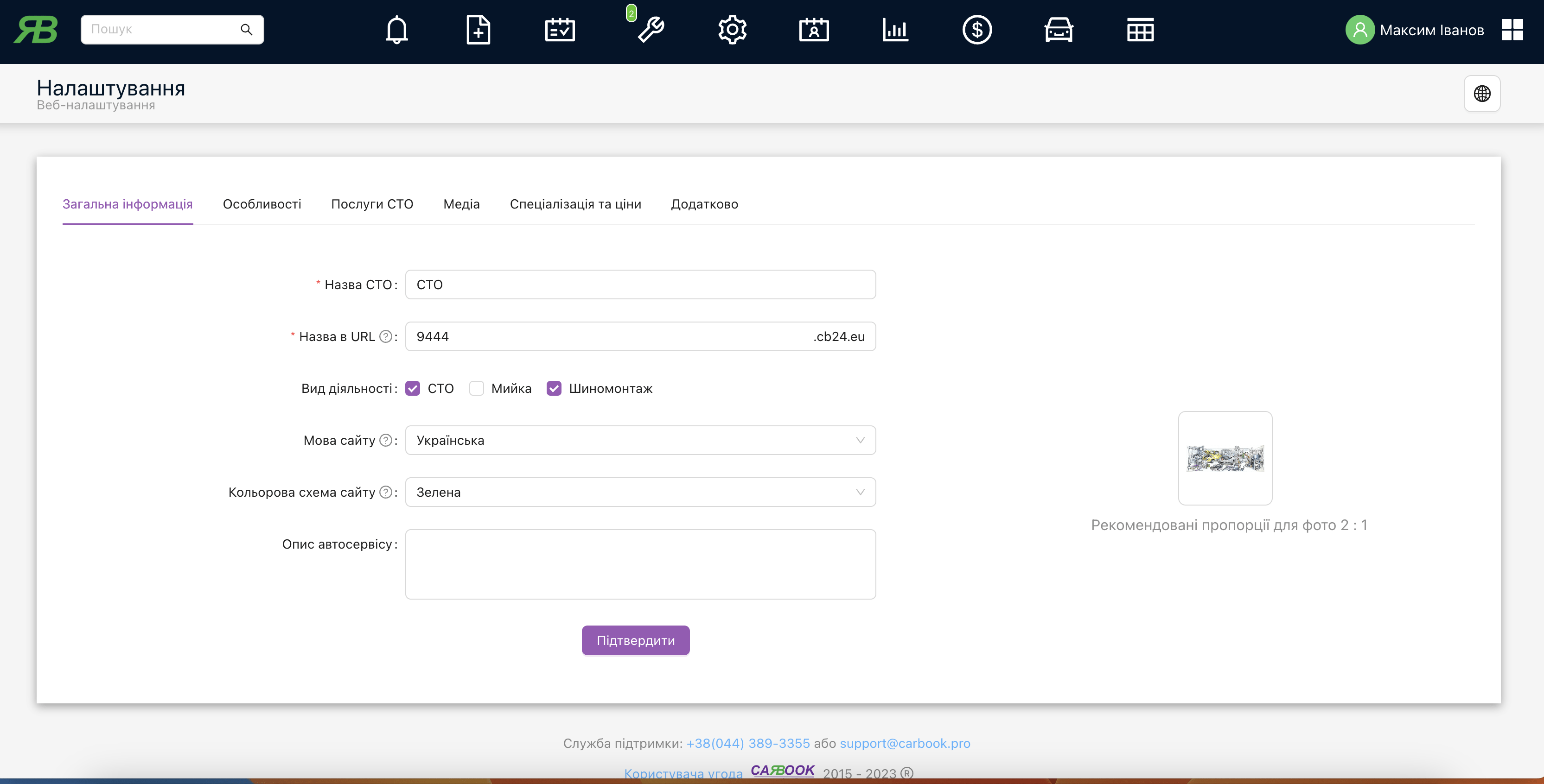 В Меню – “Налаштування”, потім “Веб-налаштування” або “Довідники та налаштування” вкладка “Налаштування СТО”, у вкладці “Загальна інформація” е “завантажити лого” ця кнопка дає можливість завантажити логотип, який буде видно користувачам на вашому сайті. Краще додавати в пропорції 2:1. Є можливість переглянути та видалити, а потім завантажити новий лого.