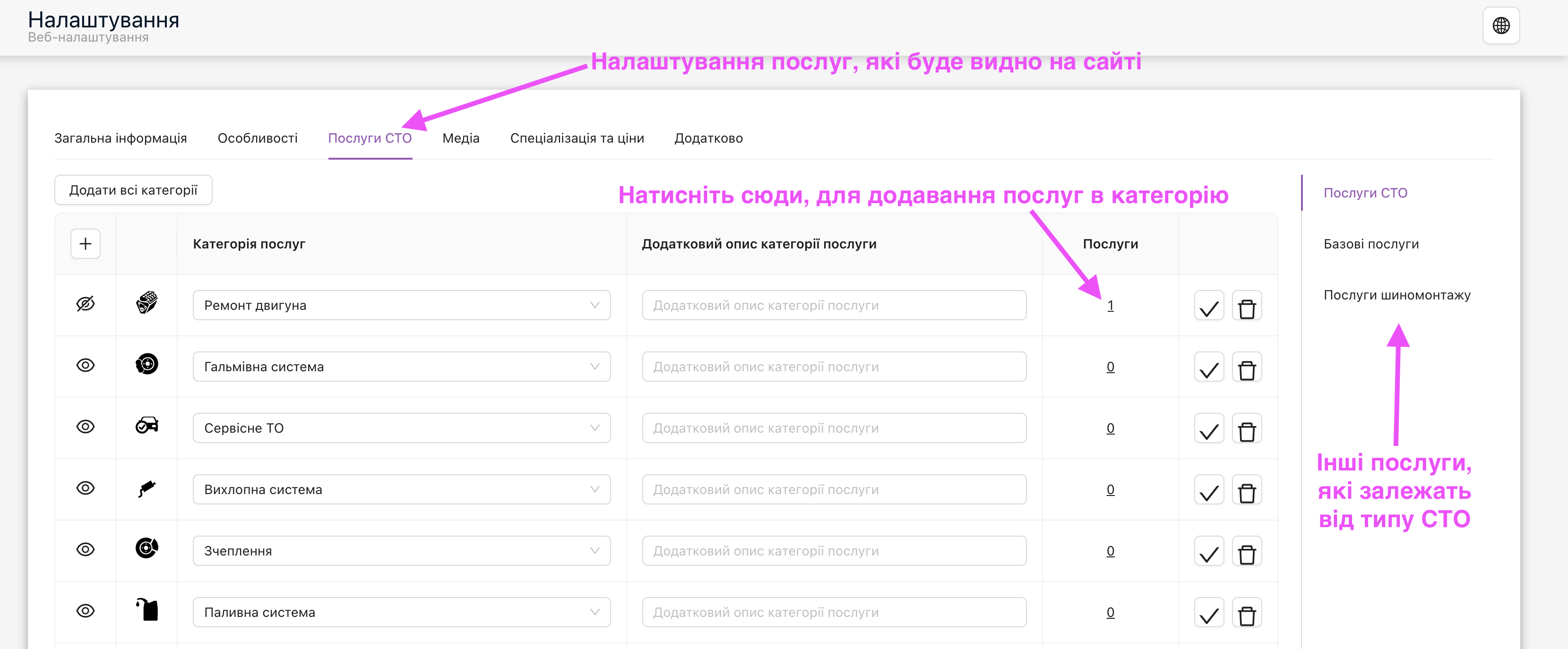 У вкладці “Особливості“ можна обрати ваші послуги, типу “оплата картою”, “кава”, “зона відпочинку” та інші. У Вкладці “Послуги СТО“ є можливість вказати категорію послуг, типу “ремонт двигуна” та вказати конкретні роботи та їх ціну в цьому розділі.