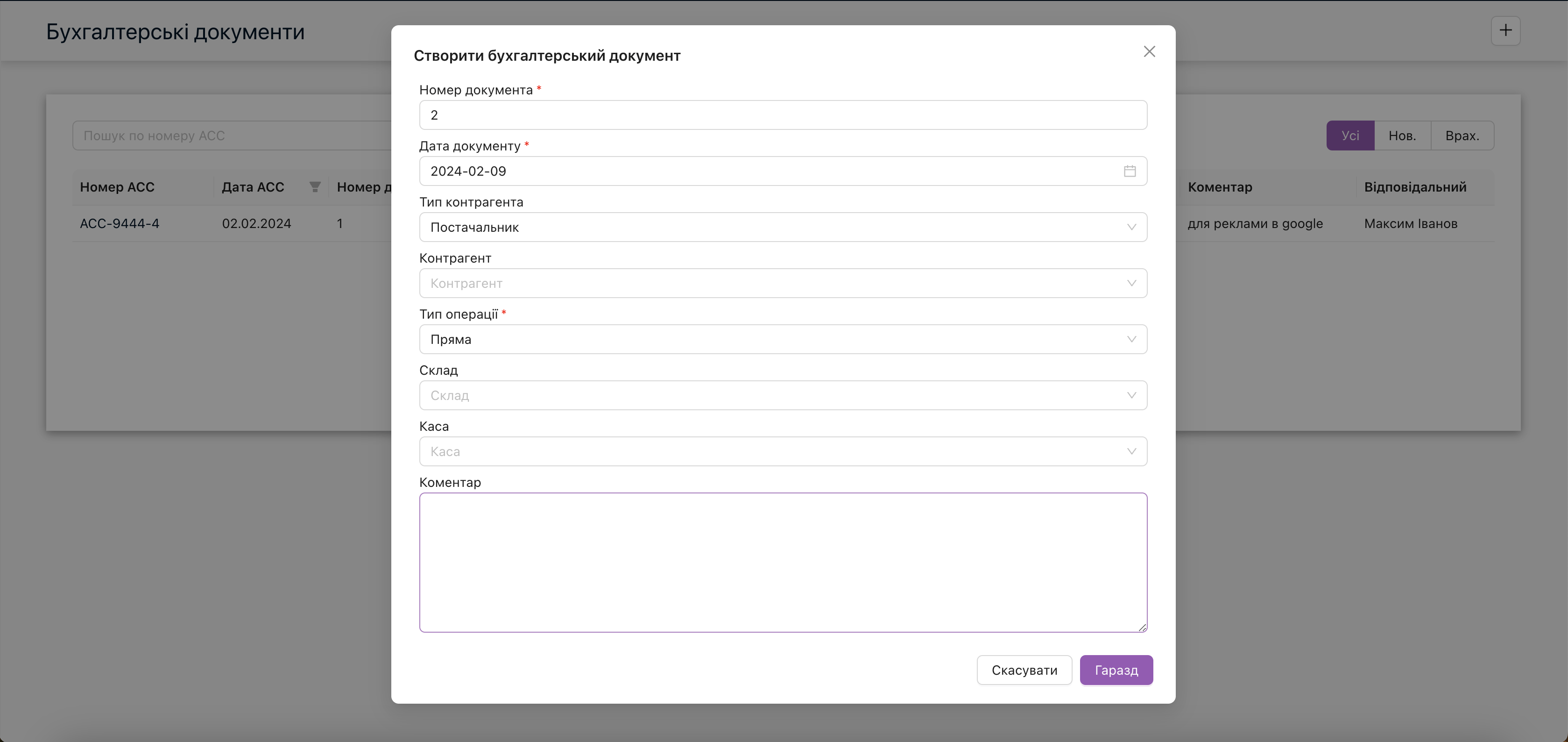 • Доступні контрагенти: Замовник, постачальник, Співробітник.