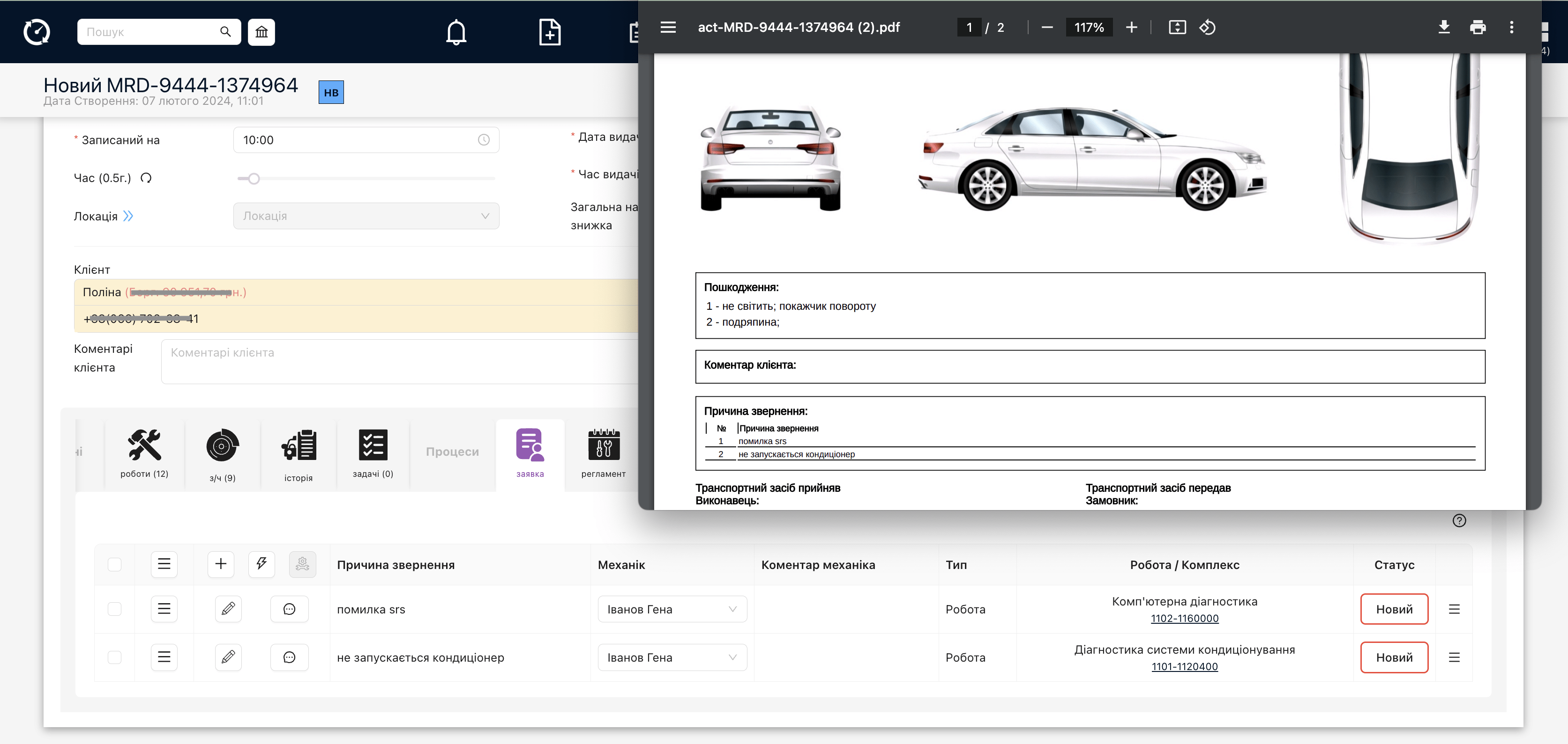 • Можна додавати роботу або комплекс робіт до рядка заявки й призначати механіка або змінювати його.
