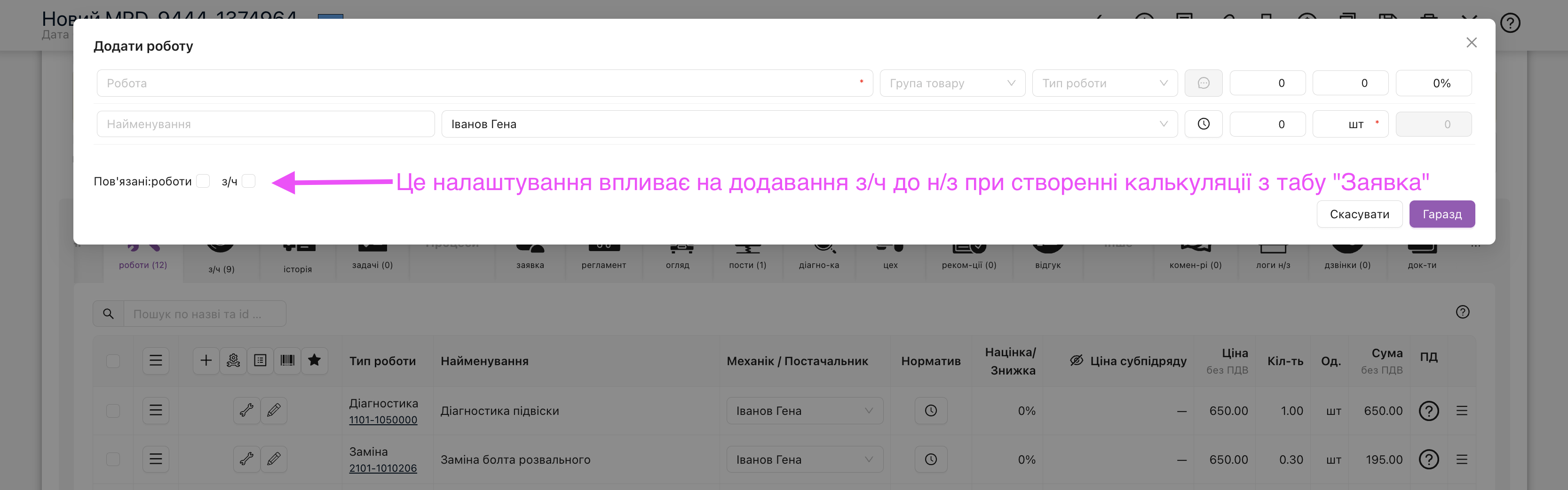 • В табі “Роботи” – кнопка «плюс» модалка додавання/редагування робіт — чекбокс «з/ч» визначає додавати чи не додавати “з/ч” при створенні калькуляції з табу Заявка.Це налаштування впливає на додавання з/ч до н/з при створенні калькуляції з табу "Заявка"