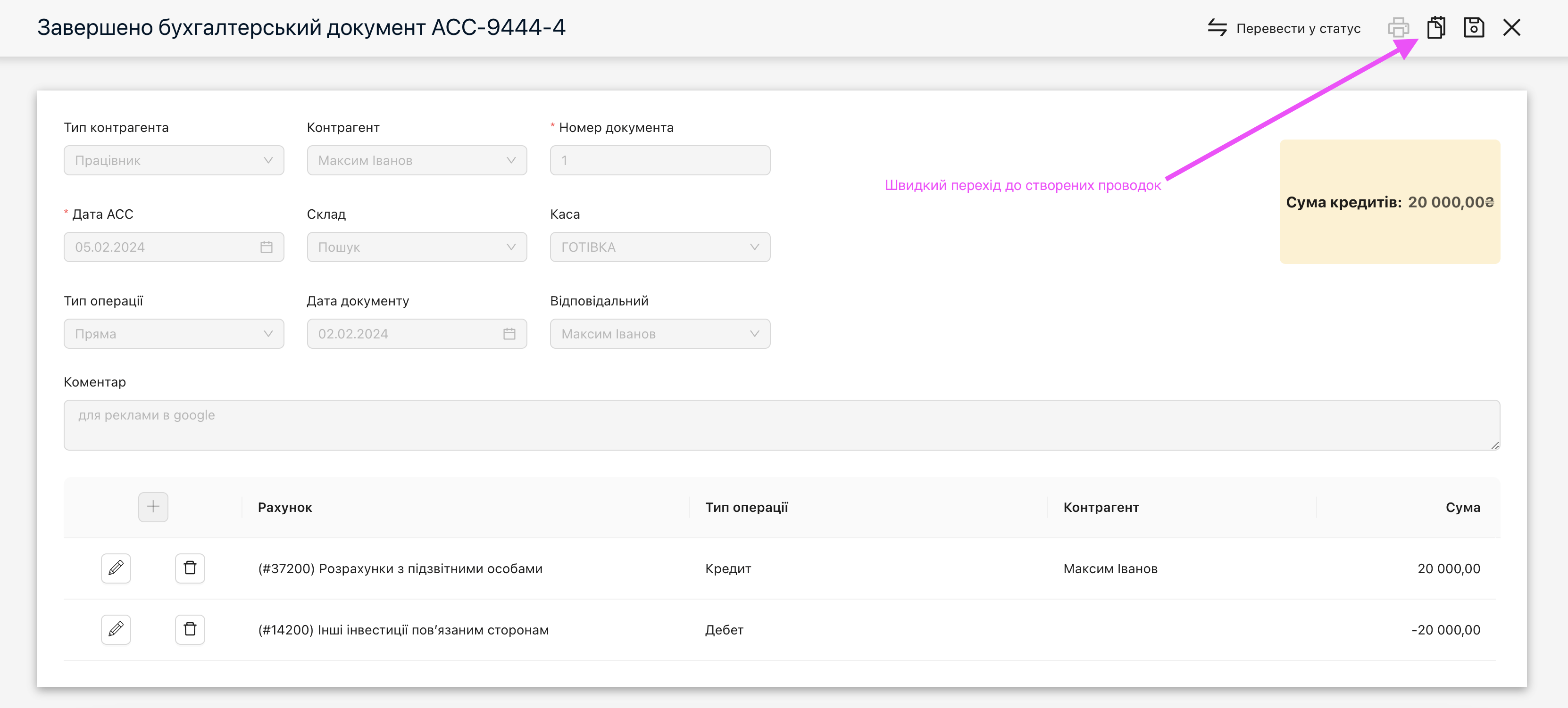 • Після зміни статусу документа ACC на «Завершено» – активна кнопка «Проводки» в шапці документа АСС, для швидкого переходу в створені проводки цим документом.Швидкий перехід до створених бухгалтерських проводок з документу АСС