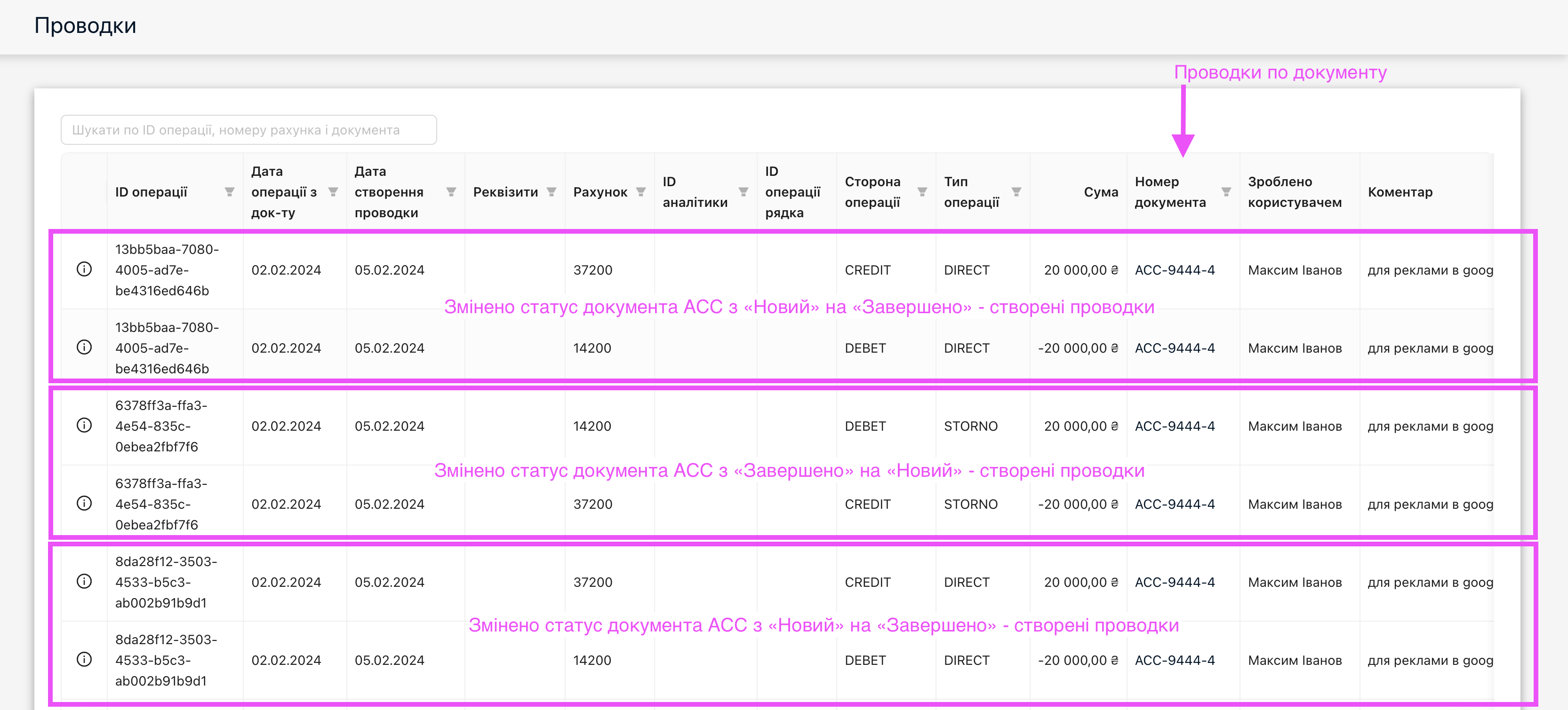 • Виводиться окремий стовпчик «Operation ID» для розуміння порядку створених проводок.