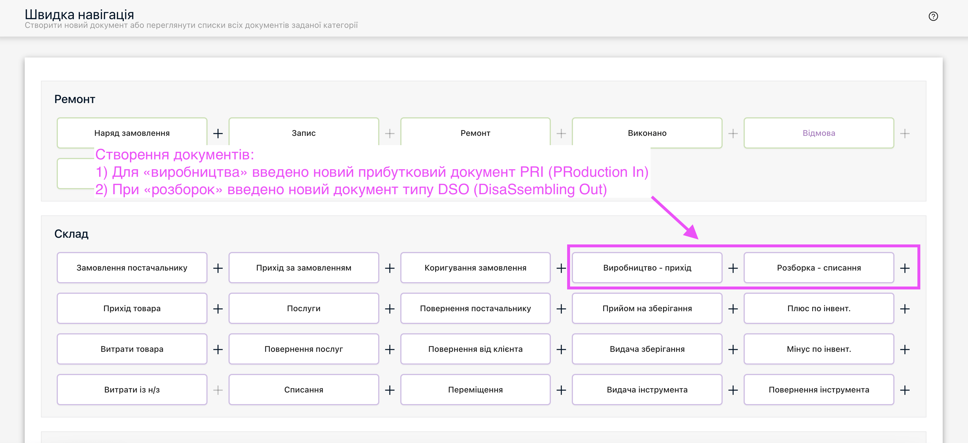 • Для «виробництва» введено новий прибутковий документ PRI (PRoduction In), де вказується скільки і яких саме товарів має бути вироблено. При врахуванні PRI на основі комплекса-калькуляції вироби автоматично створюється документ PRO (PRoduction Out), за яким списуються необхідні товари і послуги додані до комплексу типу «виробництво».Нові типи документи для виробництва та розборки