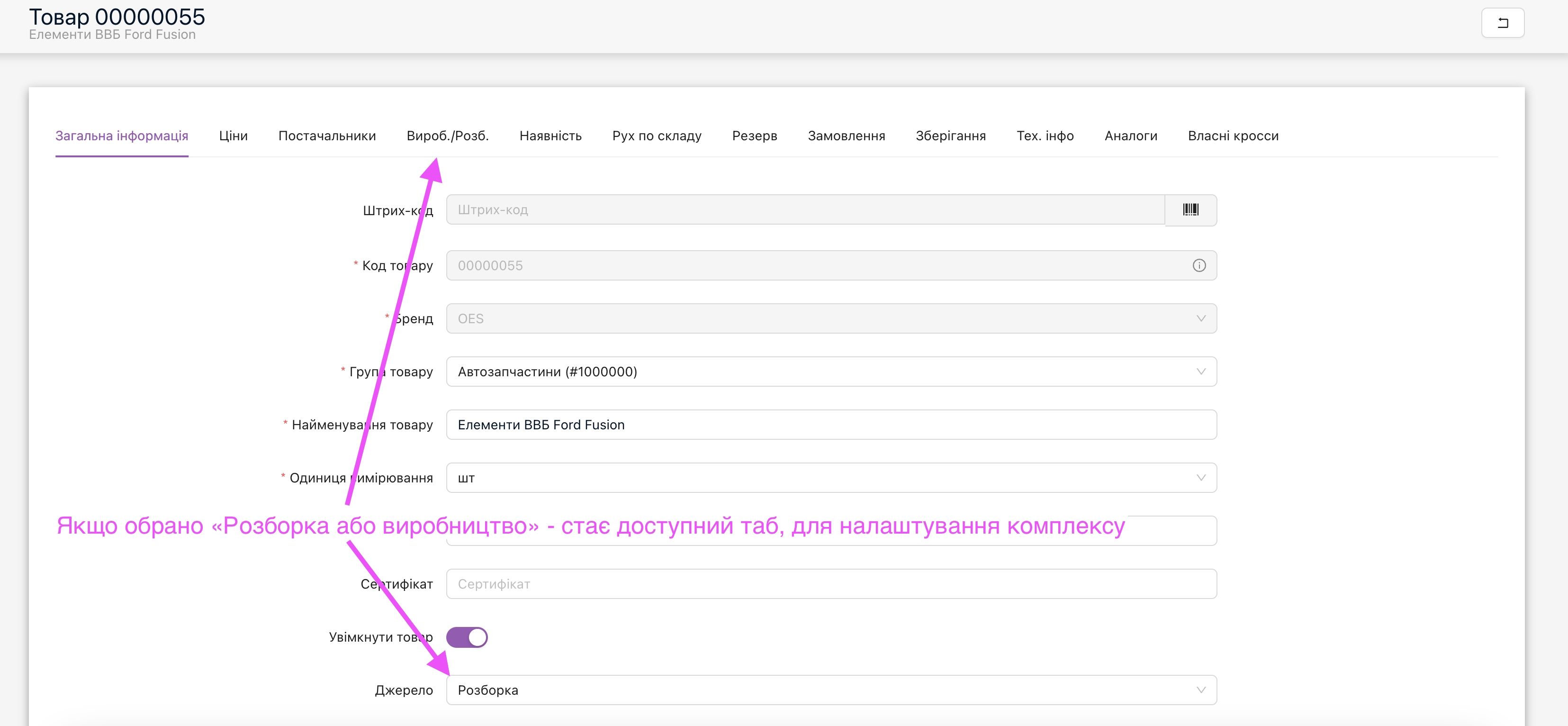 • У «Довідники та налаштування» – «Товари» – картка товару – додане поле «Джерело» – закупка, виробництво та розборка. При використанні джерела «виробництво» або «розборка» – стає доступний відповідний таб. в картці товару, для створення комплексів розборки або виробництва.Картка товару, поле «Джерело» та налашутвання комплексу для розборки чи виробництва