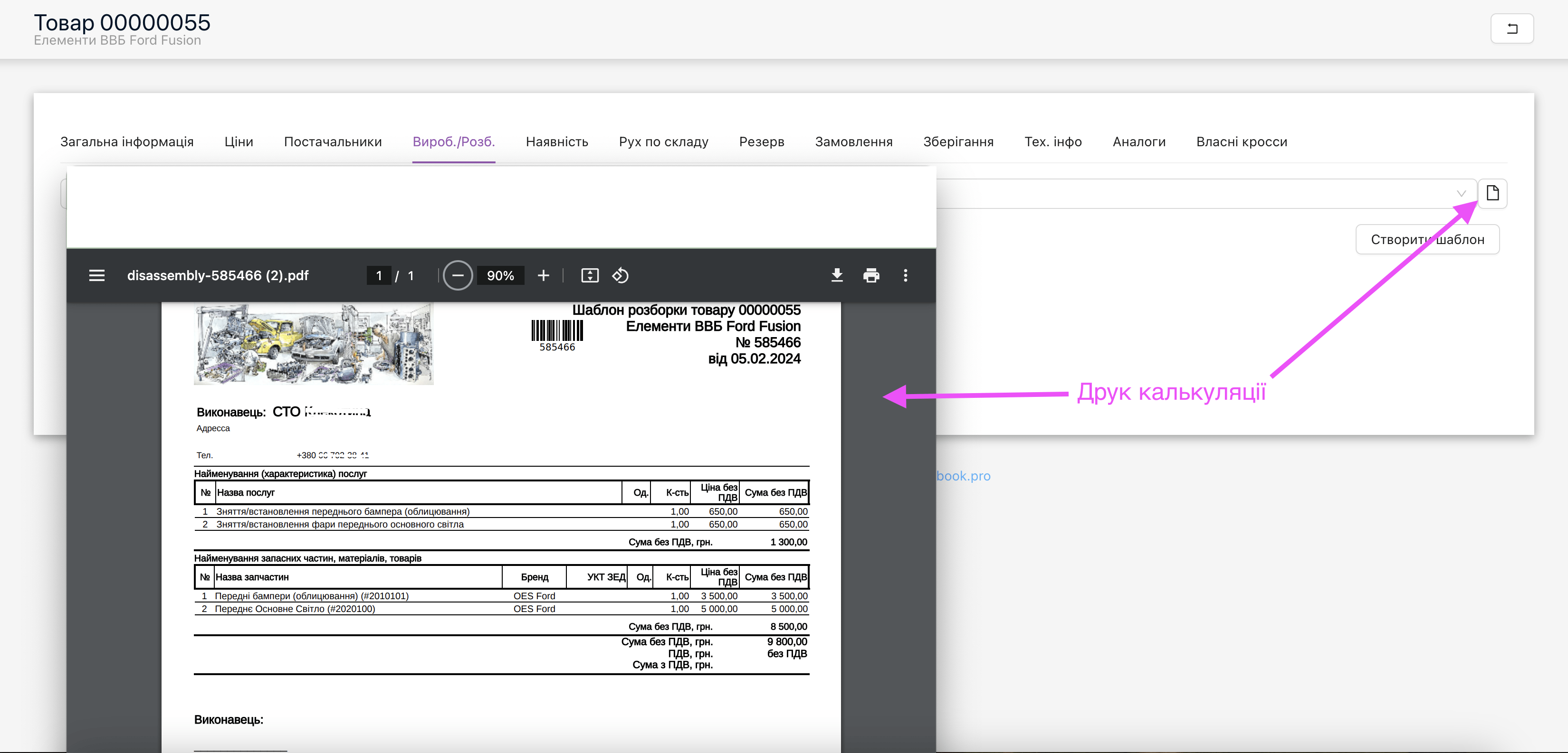 • У «Довідники та налаштування» – «Товари» – картка товару – таб «Вироб./Розб.» – кнопка створення калькуляції для розбирання чи виробництва.Друк калькуляції розборки чи виробництва