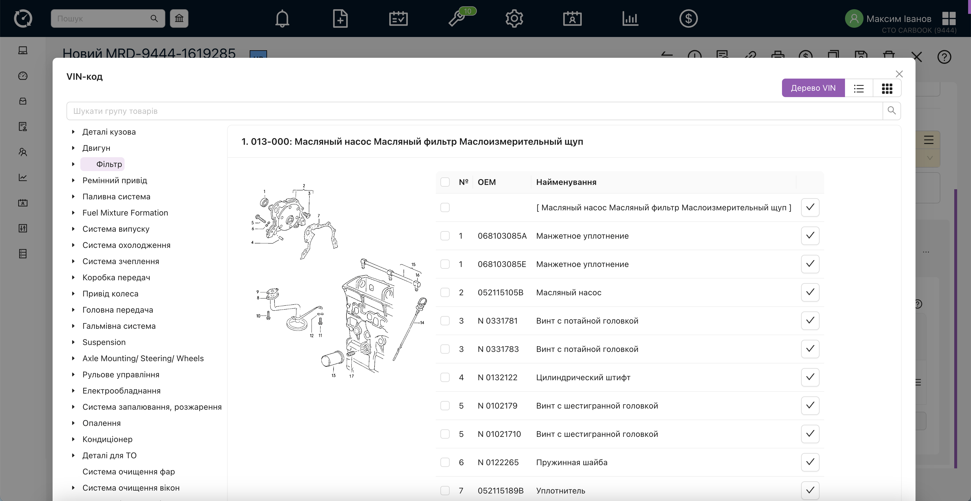 - В н/з — таб з/ч — кнопка vin – є можливість використовувати дерево, для взаємодії з елементами.