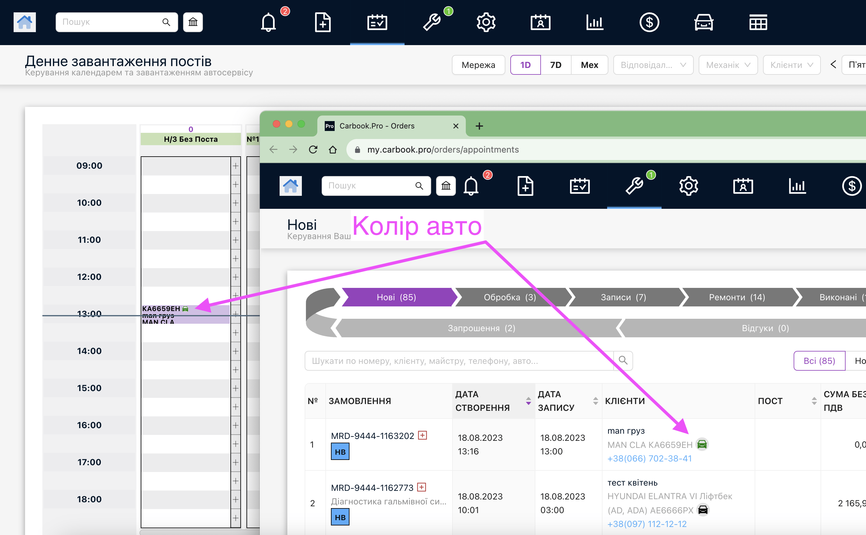 o Іконка кольору авто, в ремонтах та планувальнику.