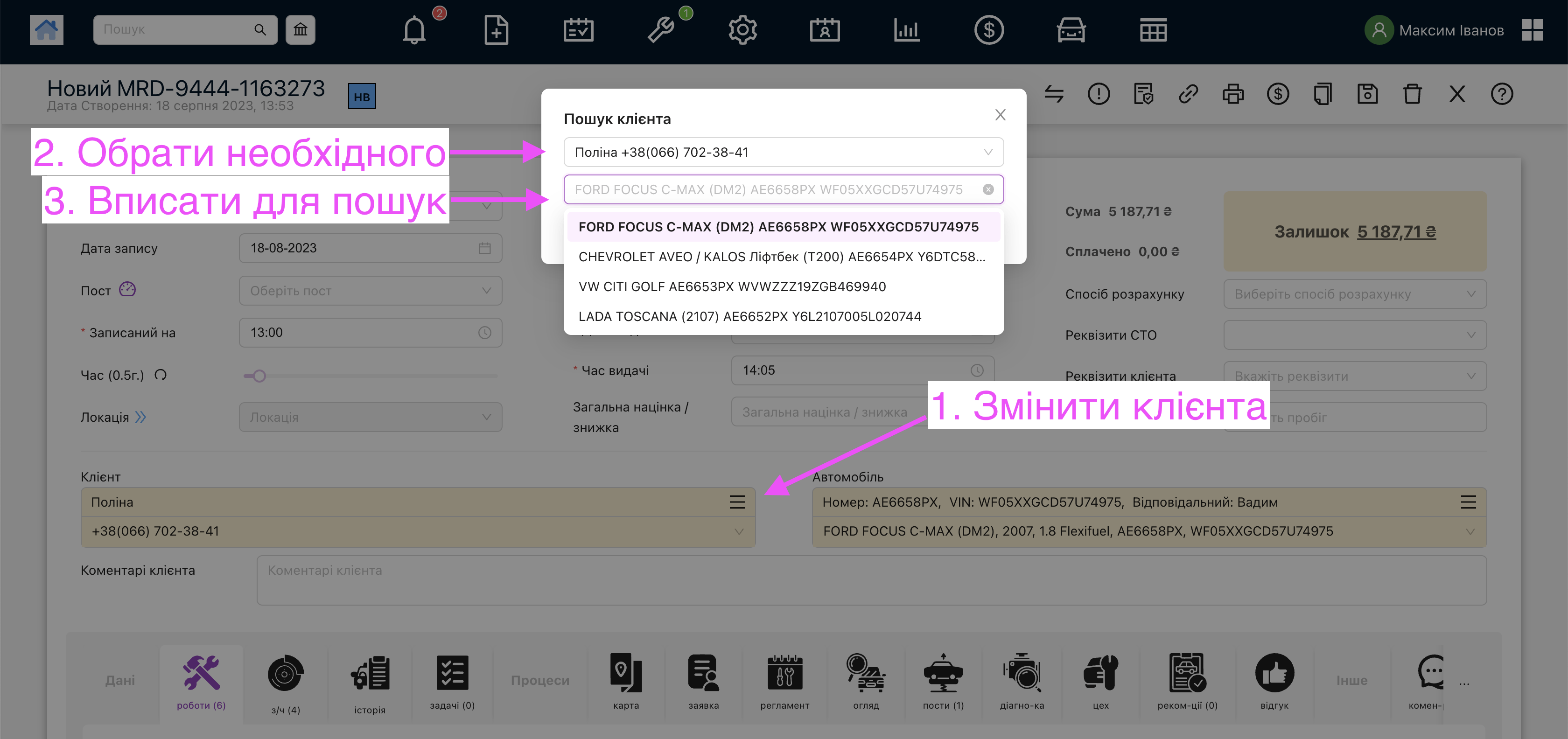 o Пошук автомобіля при зміні клієнта наряд-замовлені.