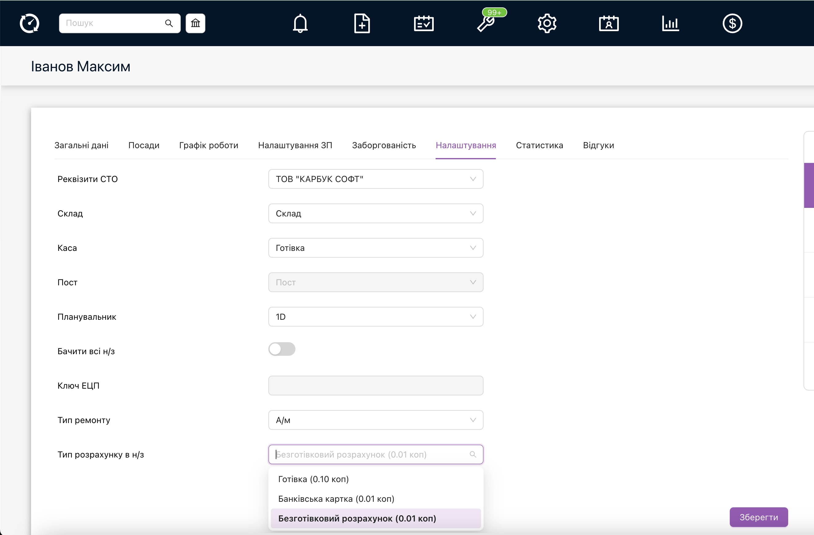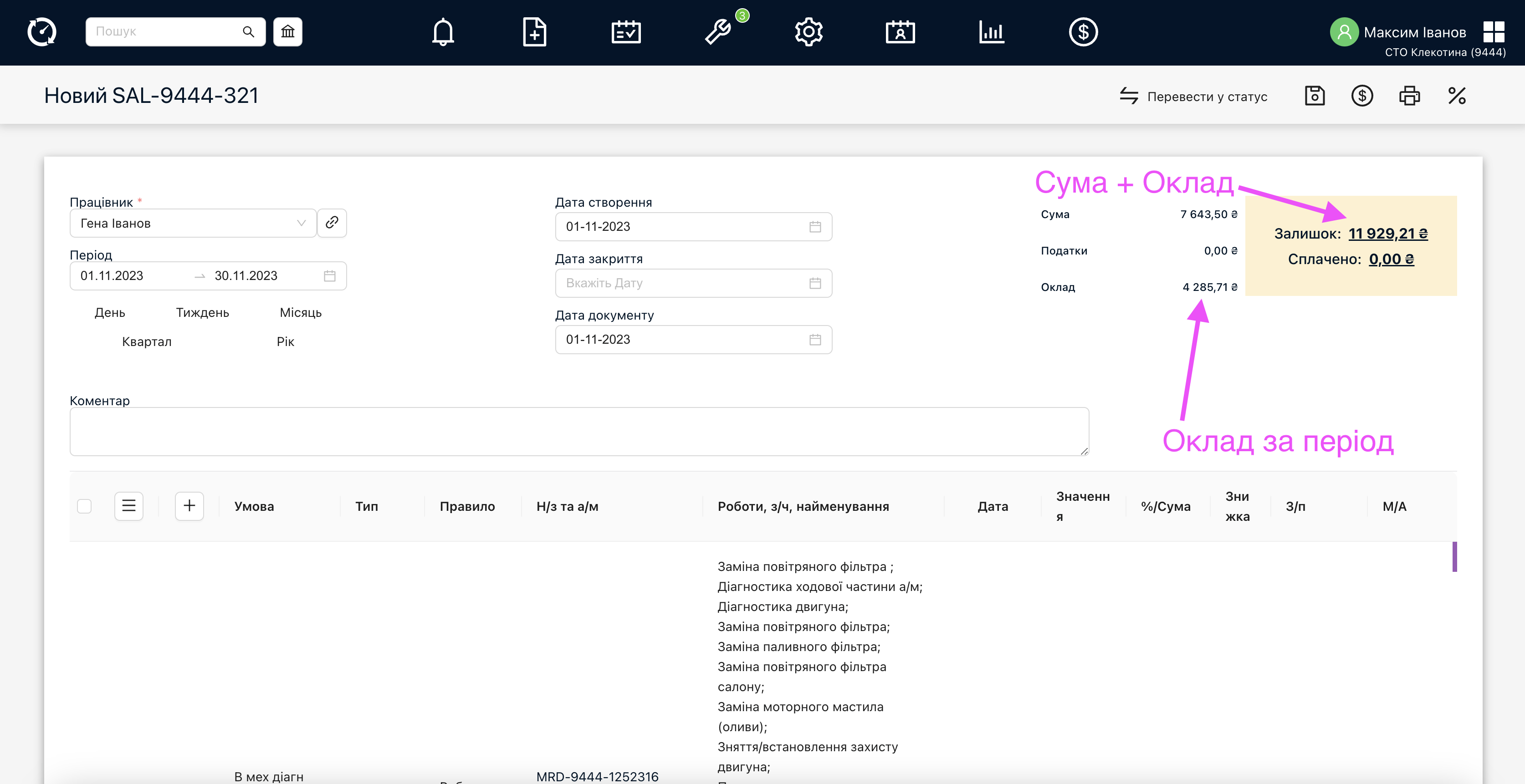 - Статистика – враховуються знижки та націнки рядків робіт та з/ч