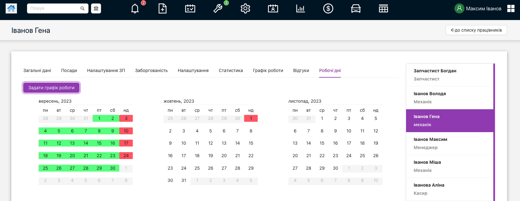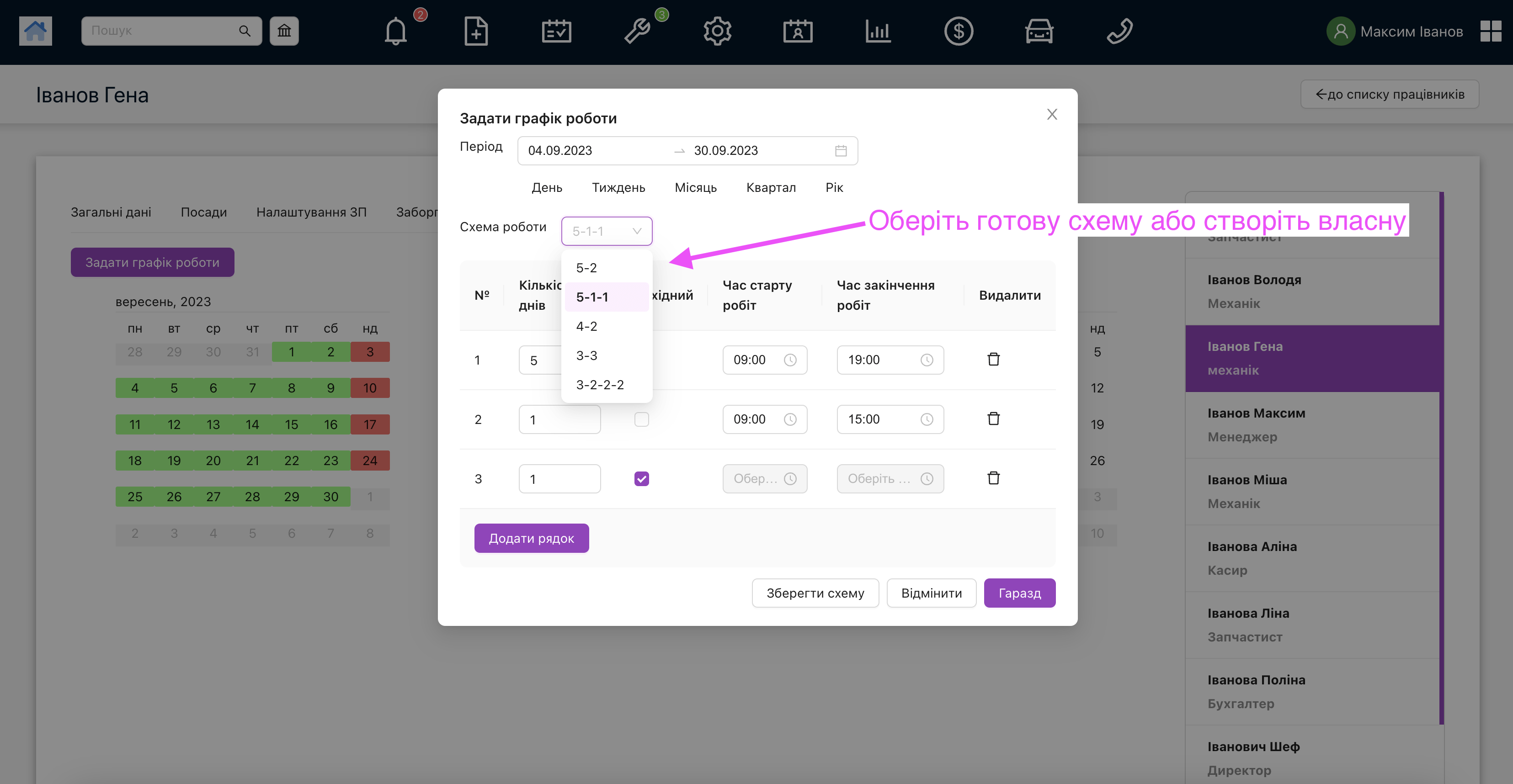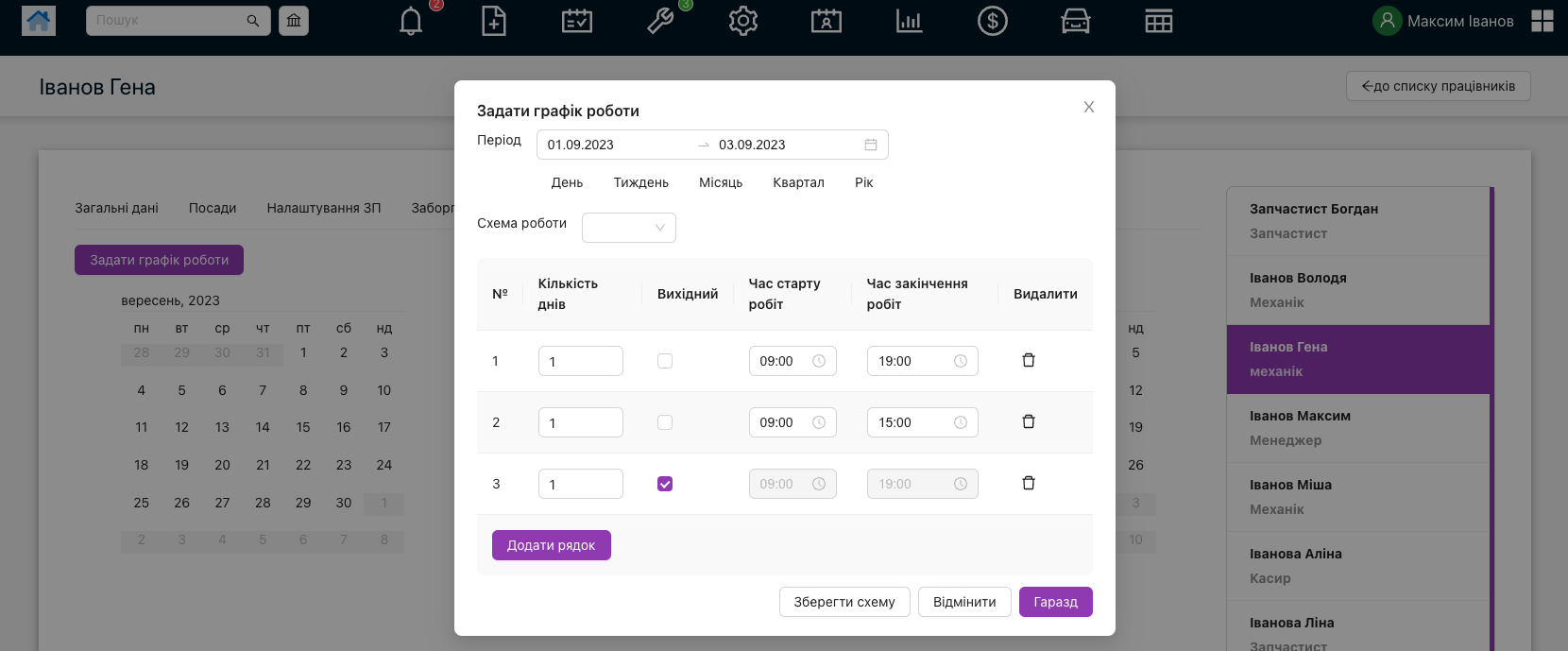 • Картка працівника — Робочі дні — Налаштування графіку роботи працівника.