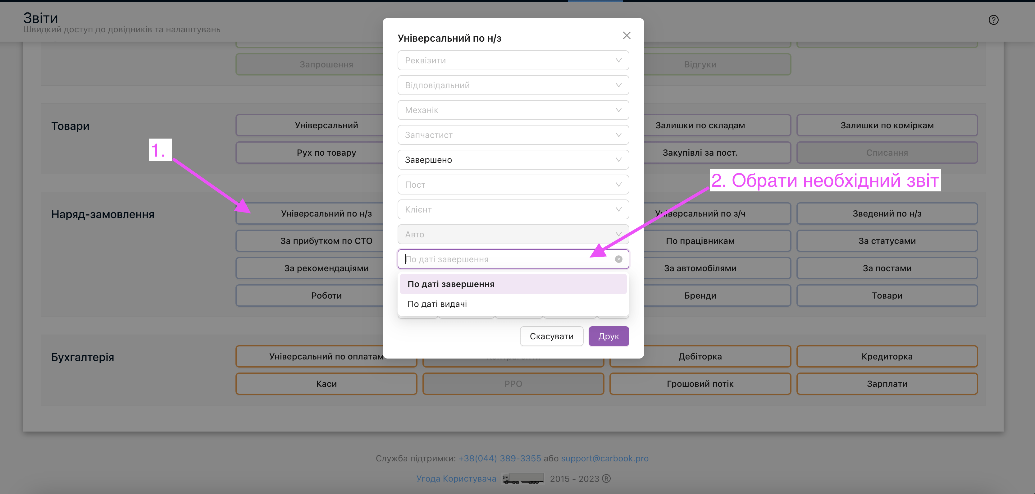 - Звіти — «За прибутком по СТО» — виведення автомобіля клієнта в рядок звіту.
