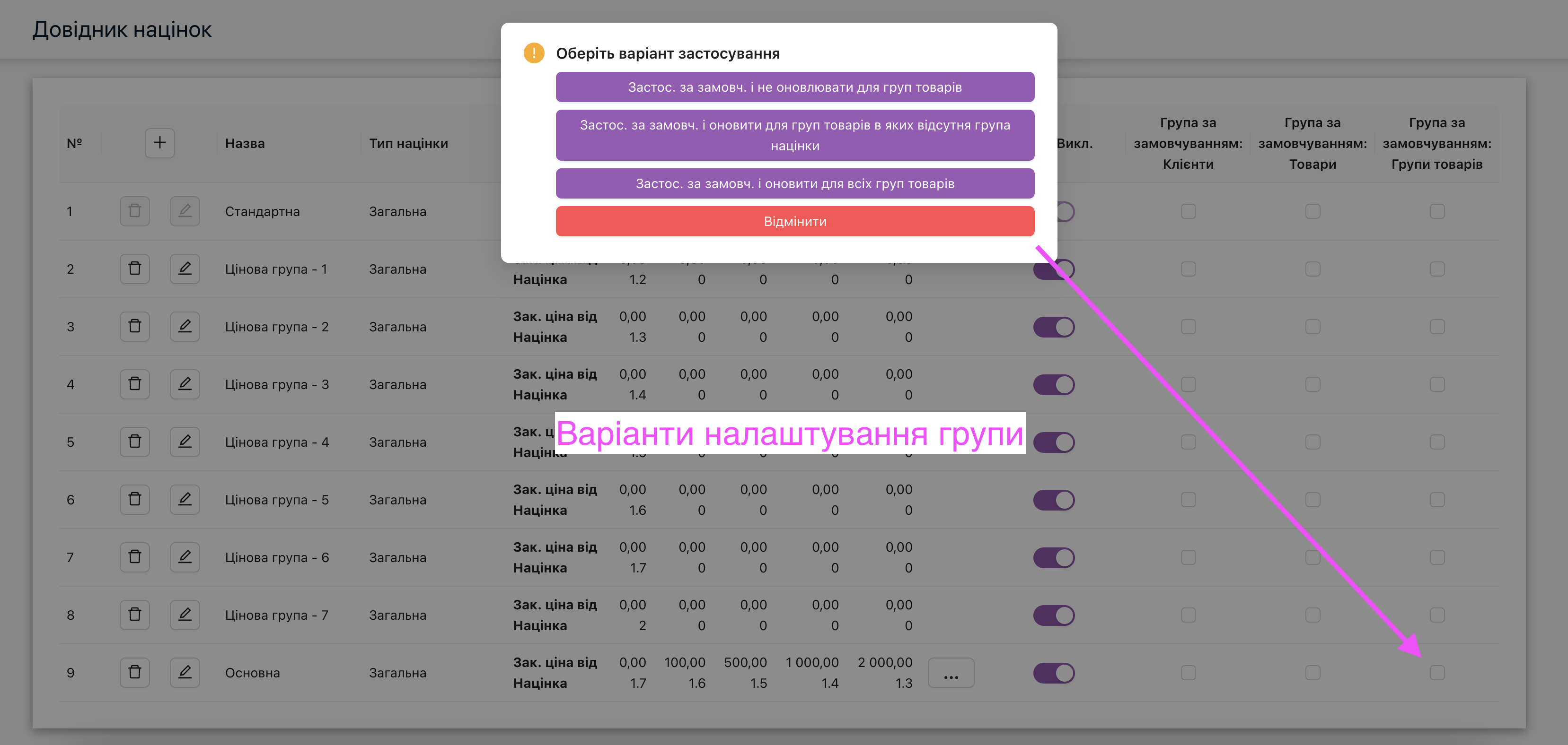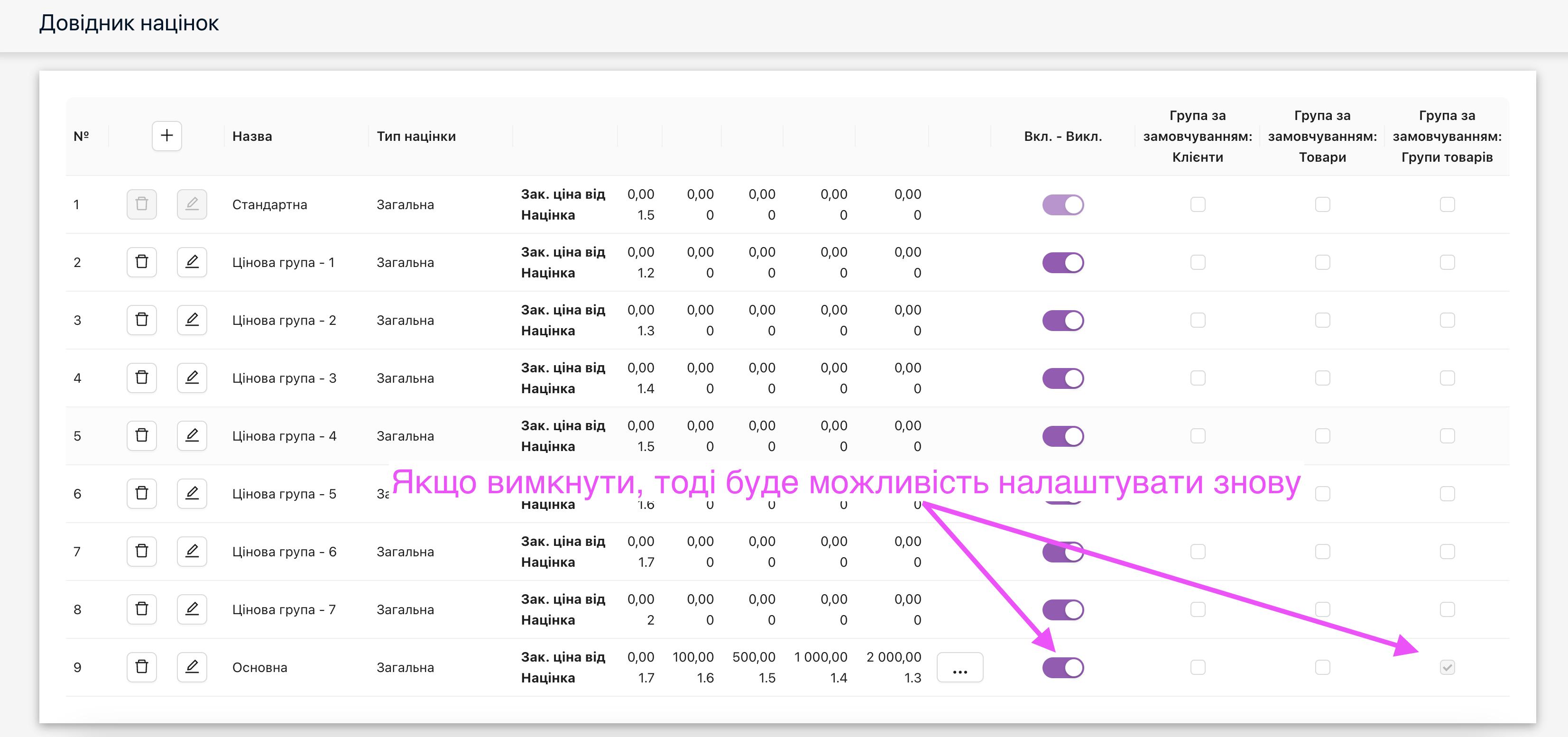 - «Довідники та налаштування» – «Групи націнок» – налаштування груп націнок та націнок за замовчуванням для нових товарів чи клієнтів.