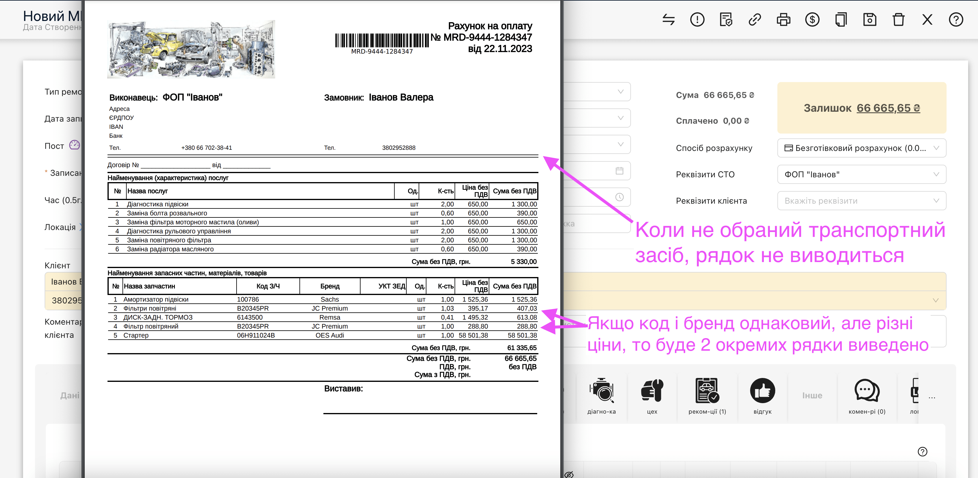 - Н/з – друк – Рахунок на оплату – якщо в н/З необраний автомобіль, то рахунок друкується без цього поля.